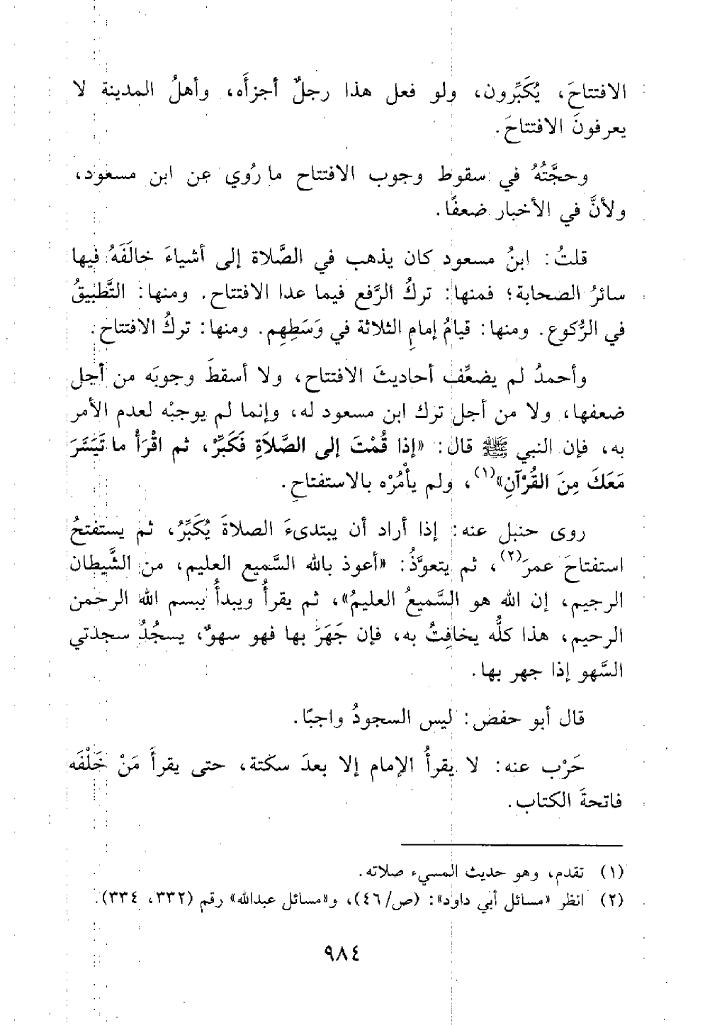 فمنها ترك الرفع فيما عدا الافتتاح ومنها التطبيق في الركوع ومنها قيام إمام الثلاثة في وسطهم ومنها ترك الافتتاح وأحمد لم يضعف أحاديث الافتتاح ولا أسقط وجوبة من أجل ضعفها ولا من أجل ترك ابن مسعود له وإنما لم يوجبه لعدم الأمر به فإن النبي قال إذا قمت إلى الصلاة فكبر ثم اقرأ ما تيسر معك من القرآن ولم يأمره بالاستفتاح