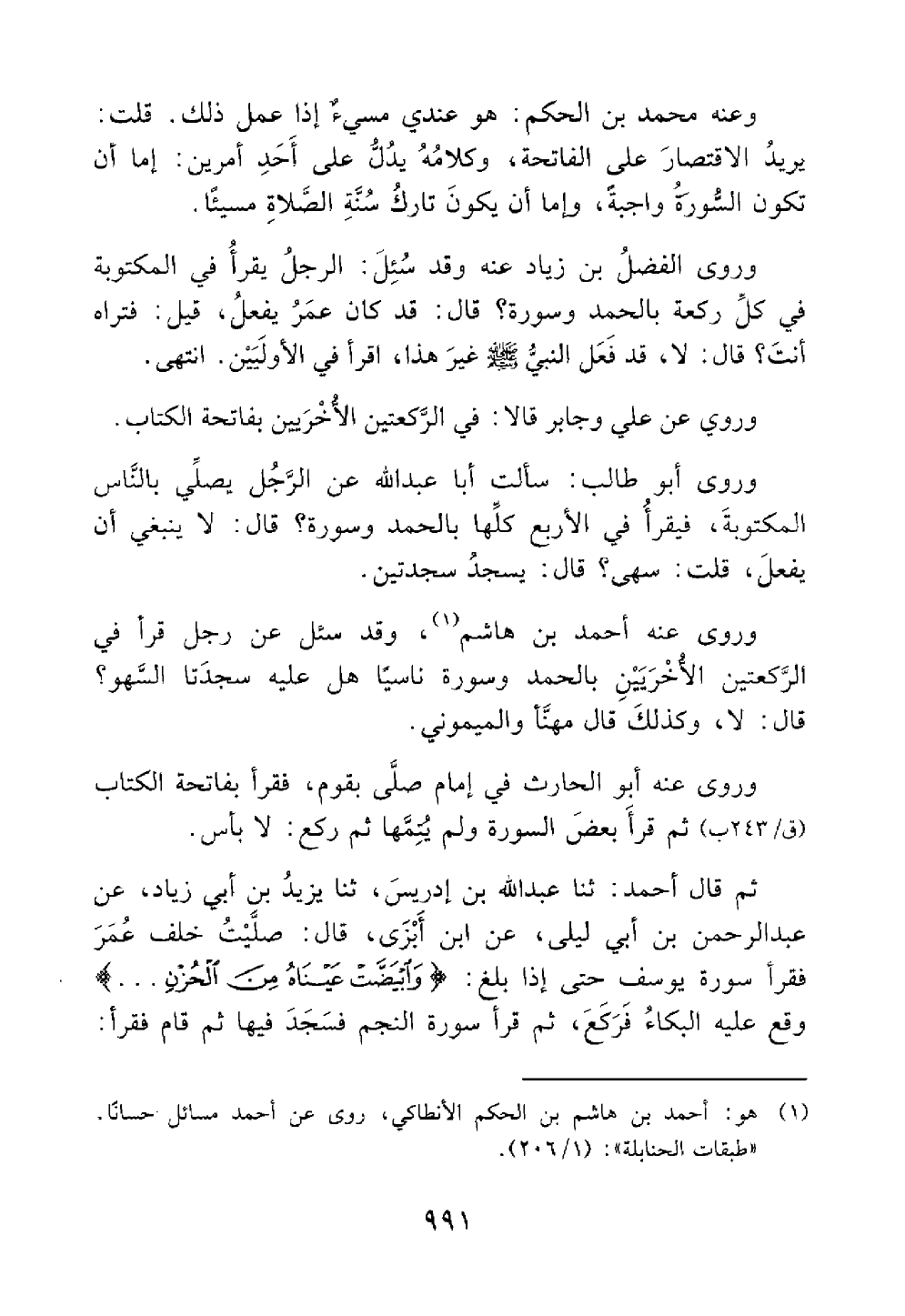 وروى الفضل بن زياد عنه وقد سئل الرجل يقرأفي المكتوبة في كل ركعة بالحمد لله وسورة قال قد كان عمر يفعل قيل فترات قال لا قد فعل النبي هذا اقرأفي الأوليين انتهى