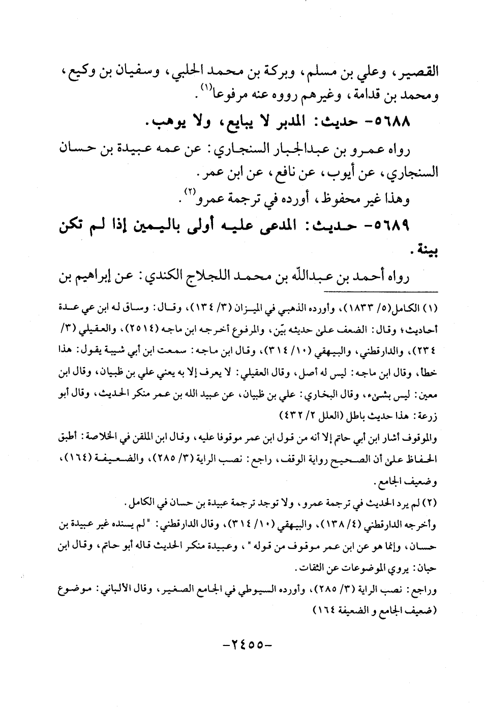 الْقصير، وَعلي بن مُسلم، وبركة بن مُحَمَّد الْحلَبِي، وسُفْيَان بن وَكِيع، وَمُحَمّد بن قدامَة، وَغَيرهم رَوَوْهُ عَنهُ مَرْفُوعا. 5688 - حَدِيث: الْمُدبر لَا يُبَايع، وَلَا يُوهب. رَوَاهُ عَمْرو بن عبد الْجَبَّار السنجاري: عَن عَمه عُبَيْدَة بن حسان السنجاري، عَن أَيُّوب، عَن نَافِع، عَن ابْن عمر. وَهَذَا غير مَحْفُوظ، أوردهُ فِي تَرْجَمَة عَمْرو.