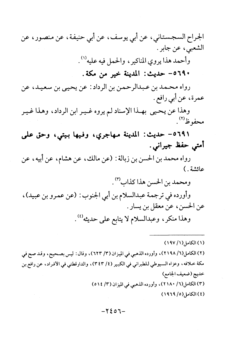 5690 - حَدِيث: الْمَدِينَة خير من مَكَّة. رَوَاهُ مُحَمَّد بن عبد الرَّحْمَن بن الرداد: عَن يحيى بن سعيد، عَن عمْرَة، عَن أبي رَافع. وَهَذَا عَن يحيى بِهَذَا الْإِسْنَاد لم يروه غير ابْن الرداد، وَهَذَا غير مَحْفُوظ. 5691 - حَدِيث: الْمَدِينَة مُهَاجِرِي، وفيهَا بَيْتِي، وَحقّ على أمتِي حفظ جيراني. رَوَاهُ مُحَمَّد بن الْحسن بن زبالة: (عَن مَالك، عَن هِشَام، عَن أَبِيه، عَن عَائِشَة.) وَمُحَمّد بن الْحسن هَذَا كَذَّاب. وَأوردهُ فِي تَرْجَمَة عبد السَّلَام بن أبي الْجنُوب: (عَن عَمْرو بن عبيد) ، عَن الْحسن، عَن معقل بن يسَار. وَهَذَا مُنكر، وَعبد السَّلَام لَا يُتَابع على حَدِيثه.