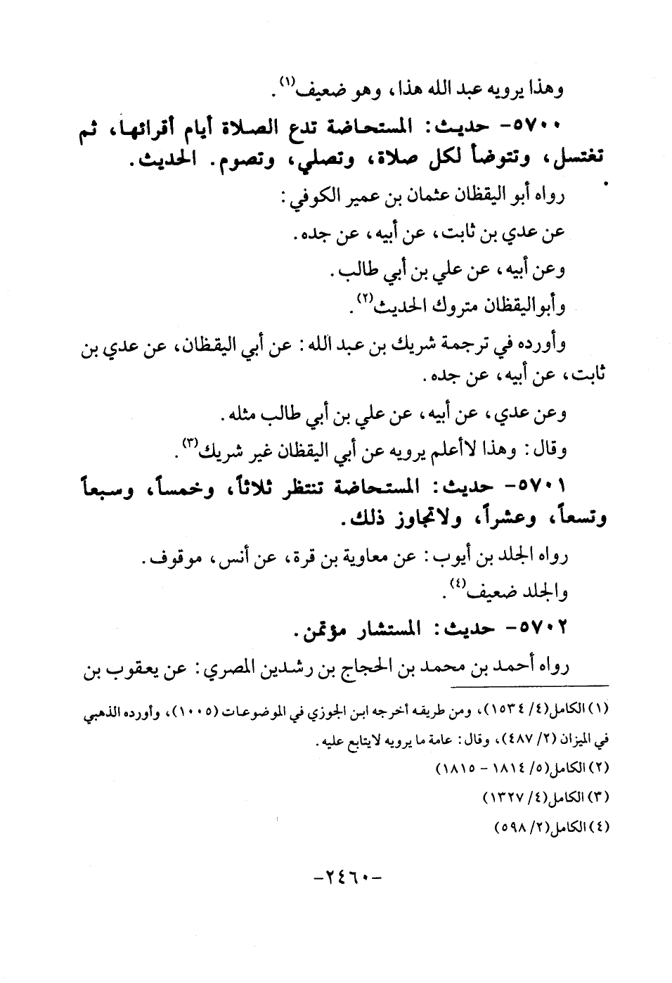 5700 - حَدِيث: الْمُسْتَحَاضَة تدع الصَّلَاة أَيَّام أقرائها، ثمَّ تَغْتَسِل، وتتوضأ لكل صَلَاة، وَتصلي، وتصوم. الحَدِيث. رَوَاهُ أَبُو الْيَقظَان عُثْمَان بن عُمَيْر الْكُوفِي: عَن عدي بن ثَابت، عَن أَبِيه، عَن جده. وَعَن أَبِيه، عَن عَليّ بن أبي طَالب. وَأَبُو الْيَقظَان مَتْرُوك الحَدِيث. وَأوردهُ فِي تَرْجَمَة شريك بن عبد الله: عَن أبي الْيَقظَان، عَن عدي بن ثَابت، عَن أَبِيه، عَن جده. وَعَن عدي، عَن أَبِيه، عَن عَليّ بن أبي طَالب مثله. وَقَالَ: وَهَذَا لَا أعلم يرويهِ عَن أبي الْيَقظَان غير شريك.