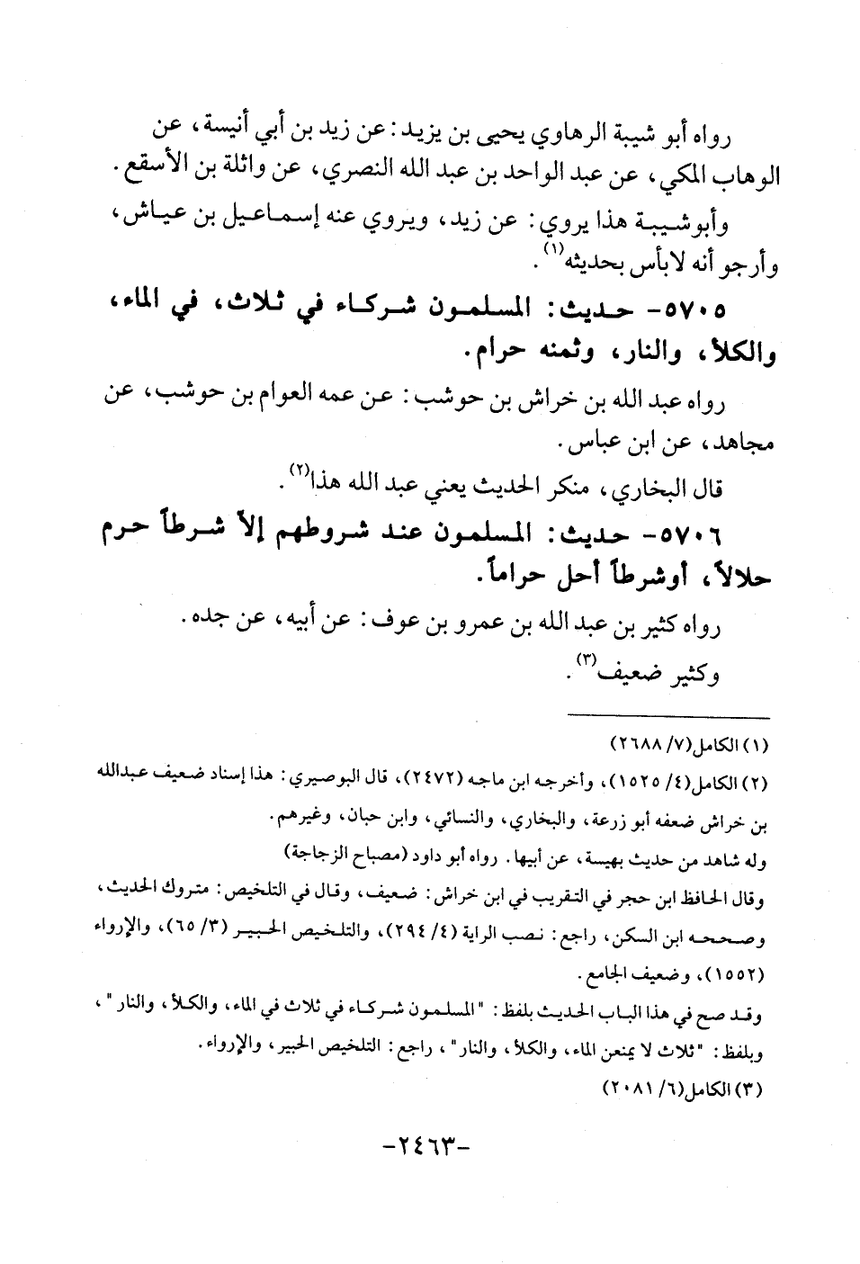 5705 - حَدِيث: الْمُسلمُونَ شُرَكَاء فِي ثَلَاث، فِي المَاء، والكلأ، وَالنَّار، وثمنه حرَام. رَوَاهُ عبد الله بن خرَاش بن حَوْشَب: عَن عَمه الْعَوام بن حَوْشَب، عَن مُجَاهِد، عَن ابْن عَبَّاس. قَالَ البُخَارِيّ، مُنكر الحَدِيث يَعْنِي عبد الله هَذَا.