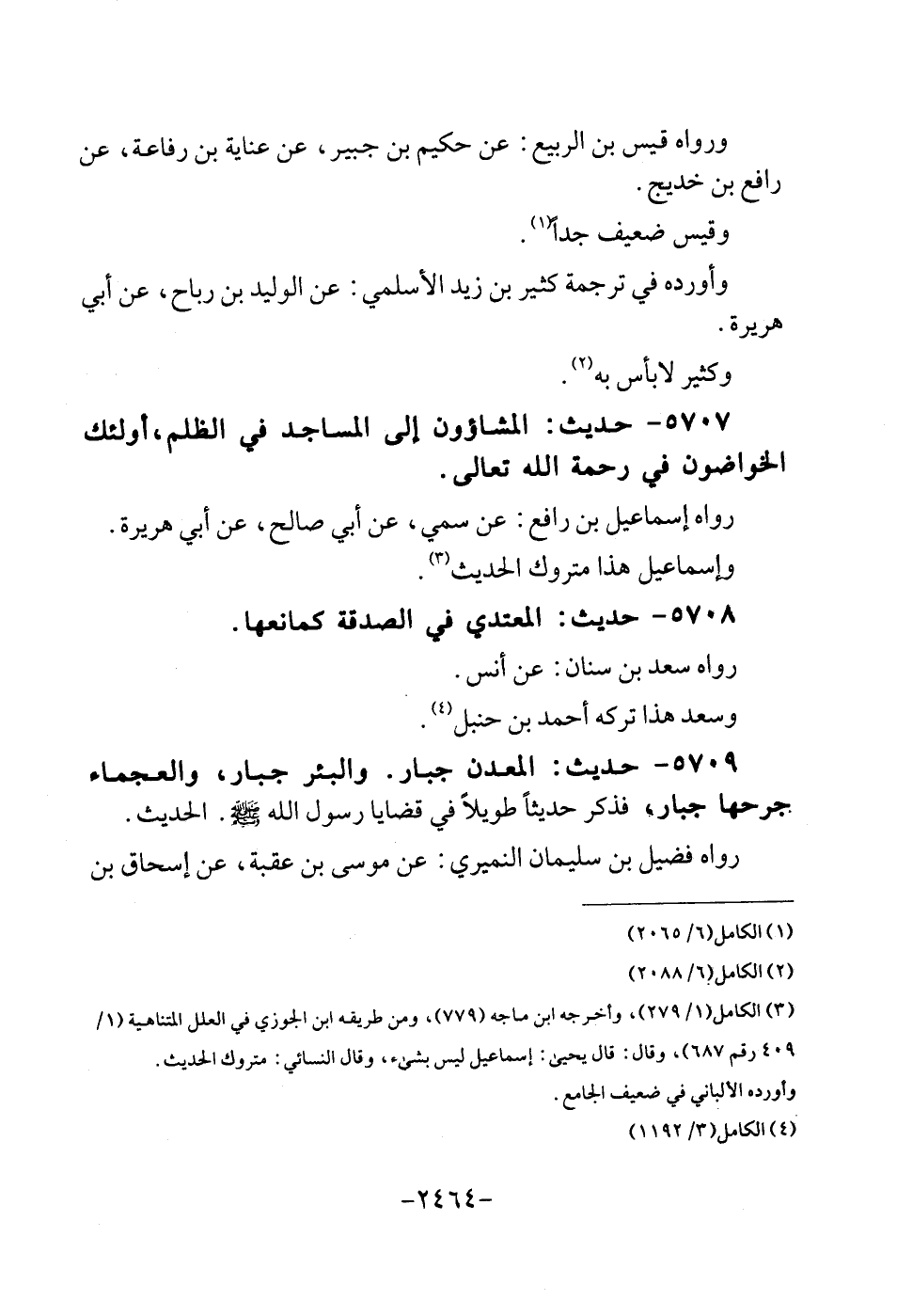 5707 - حَدِيث: المشاؤون إِلَى الْمَسَاجِد فِي الظُّلم، أُولَئِكَ الخواضون فِي رَحْمَة الله تَعَالَى. رَوَاهُ إِسْمَاعِيل بن رَافع: عَن سمي، عَن أبي صَالح، عَن أبي هُرَيْرَة. وَإِسْمَاعِيل هَذَا مَتْرُوك الحَدِيث.