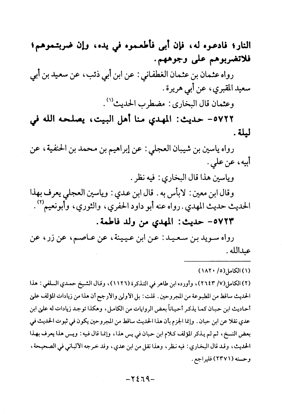 5722 - حَدِيث: الْمهْدي منا أهل الْبَيْت، يصلحه الله فِي لَيْلَة. رَوَاهُ ياسين بن شَيبَان الْعجلِيّ: عَن إِبْرَاهِيم بن مُحَمَّد بن الحنفيهّ، عَن أَبِيه، عَن عَليّ. وَيَاسِين هَذَا قَالَ البُخَارِيّ: فِيهِ نظر. وَقَالَ ابْن معِين: لَا بَأْس بِهِ. قَالَ ابْن عدي: وَيَاسِين الْعجلِيّ يعرف بِهَذَا الحَدِيث حَدِيث الْمهْدي. رَوَاهُ عَنهُ أَبُو دَاوُد الْحَفرِي، وَالثَّوْري، وَأَبُو نعيم.