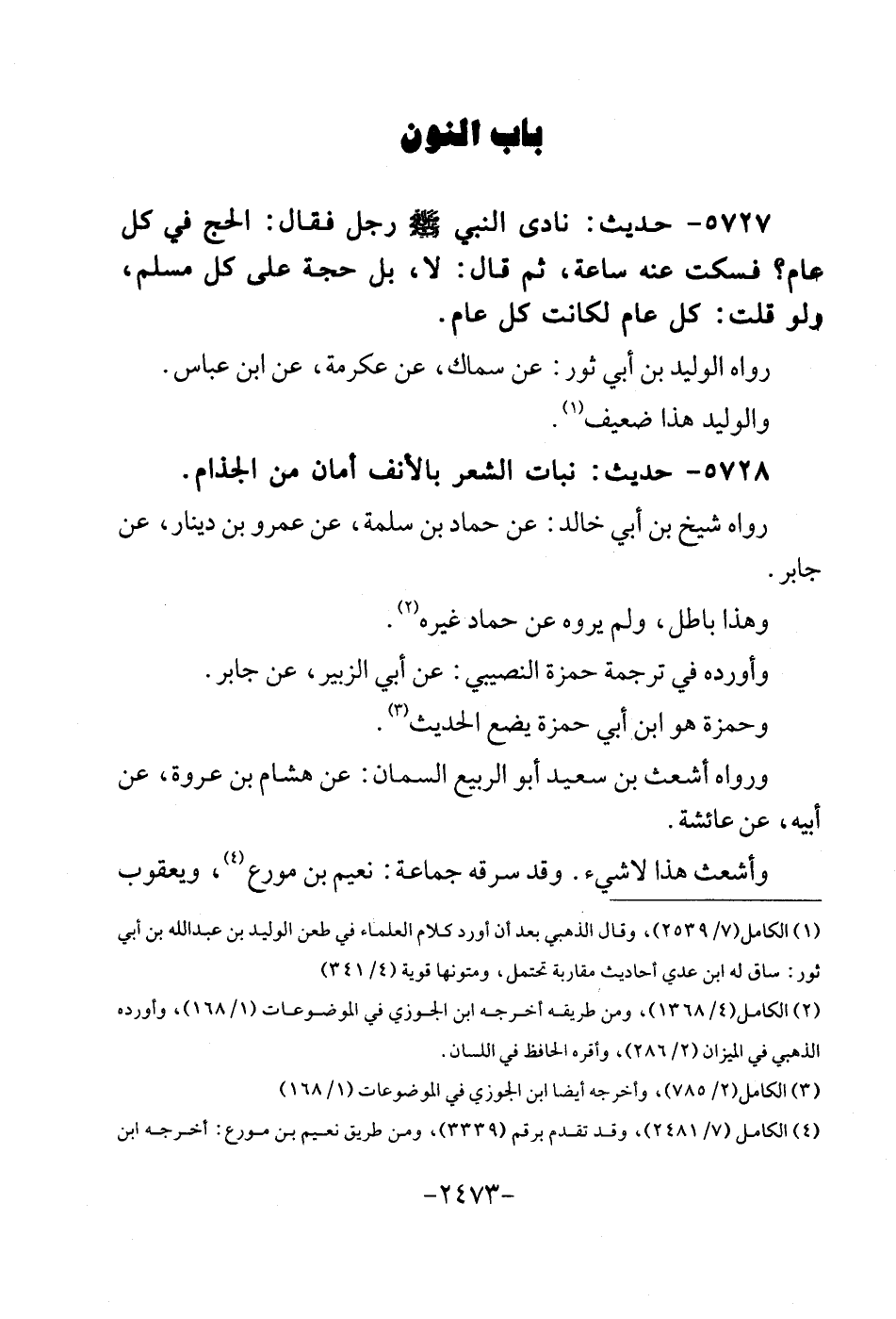 5727 - حَدِيث: نَادَى النَّبِي - صلى الله عَلَيْهِ وَسلم - رجل فَقَالَ: الْحَج فِي كل عَام؟ فَسكت عَنهُ سَاعَة، ثمَّ قَالَ: لَا، بل حجَّة على كل مُسلم، وَلَو قَالَت: كل عَام لكَانَتْ كل عَام. رَوَاهُ الْوَلِيد بن أبي ثَوْر: عَن سماك، عَن عِكْرِمَة، عَن ابْن عَبَّاس. والوليد هَذَا ضَعِيف.