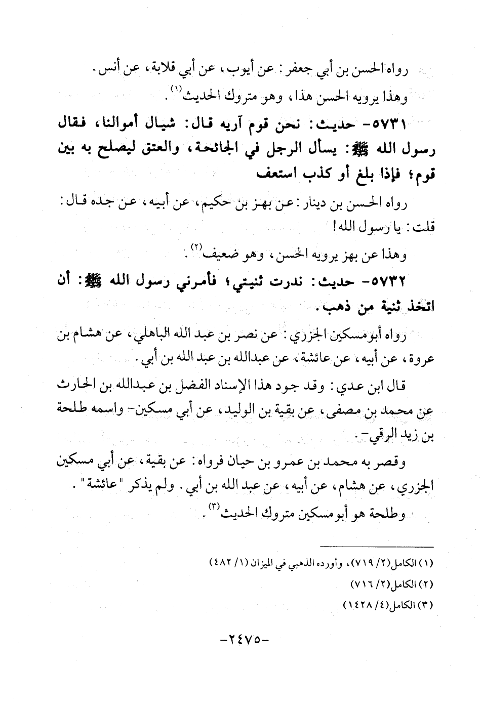 5732 - حَدِيث: ندرت ثنيتي؛ فَأمرنِي رَسُول الله - صلى الله عَلَيْهِ وَسلم -: أَن اتخذ ثنية من ذهب. رَوَاهُ أَبُو مِسْكين الجزاري: عَن نصر بن عبد الله الْبَاهِلِيّ، عَن هِشَام بن عُرْوَة، عَن أَبِيه، عَن عَائِشَة، عَن عبد الله بن عبد الله بن أبي. قَالَ ابْن عدي: وَقد جود هَذَا الْإِسْنَاد الْفضل بن عبد الله بن الْحَارِث عَن مُحَمَّد بن مصفى، عَن بَقِيَّة بن الْوَلِيد، عَن أبي مِسْكين واسْمه طَلْحَة بن زيد الرقي. وَقصر بِهِ مُحَمَّد بن عَمْرو بن حَيَّان فَرَوَاهُ: عَن بَقِيَّة، عَن أبي مِسْكين الْجَزرِي، عَن هِشَام عَن أَبِيه، عَن عبد الله بن أبي. وَلم يذكر " عَائِشَة ". وَطَلْحَة هُوَ أَبُو مِسْكين مَتْرُوك الحَدِيث. أوردهُ فِي تَرْجَمَة نصر الْبَاهِلِيّ وَهُوَ أَبُو جزي نصر بن طريف: عَن هِشَام (بن عُرْوَة، عَن أَبِيه، عَن عَائِشَة، عَن عبد الله بن عبد الله بن أبي قَالَ: ندرت سني) وَقَالَ: وَهَذَا غير مَحْفُوظ، إِنَّمَا يرويهِ نصر بن طريف، وَعَاصِم بن سُلَيْمَان هُوَ طَلْحَة بن زيد.