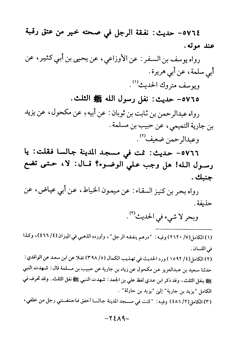 5766 - حَدِيث: نمت فِي مَسْجِد الْمَدِينَة جَالِسا فَقلت: يَا رَسُول الله! هَل وَجب عَليّ الْوضُوء؟ قَالَ: لَا، حَتَّى تضع جَنْبك. رَوَاهُ بَحر بن كنيز السقاء: عَن مَيْمُون الْخياط، عَن أبي عِيَاض، عَن حُذَيْفَة. وبحر لَا شَيْء فِي الحَدِيث.