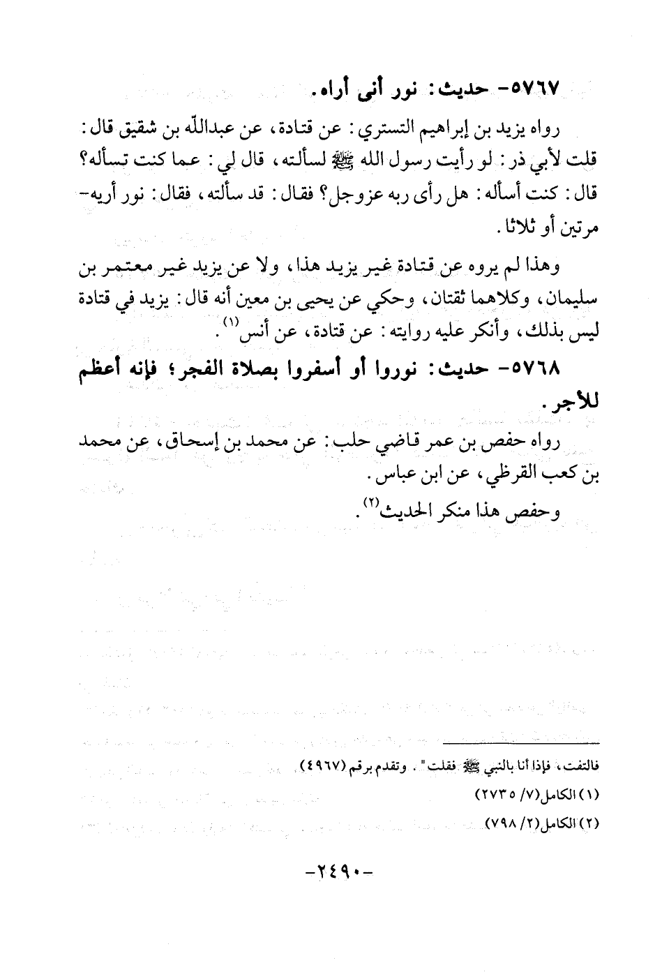 5767 - حَدِيث: نور أَنى أرَاهُ. رَوَاهُ يزِيد بن إِبْرَاهِيم التسترِي: عَن قَتَادَة، عَن عبد الله بن شَقِيق قَالَ: قلت لأبي ذَر: لَو رَأَيْت رَسُول الله لسألته، قَالَ لي: عَمَّا كنت تسأله؟ قَالَ: كنت أسأله: هَل رأى ربه عز وَجل؟ فَقَالَ: قد سَأَلته، فَقَالَ: نور أريه مرَّتَيْنِ أَو ثَلَاثًا. وَهَذَا لم بروه عَن قَتَادَة غير يزِيد هَذَا، وَلَا عَن يزِيد غير مُعْتَمر بن سُلَيْمَان، وَكِلَاهُمَا ثقتان، وَحكي عَن يحيى بن معِين أَنه قَالَ: يزِيد فِي قَتَادَة لَيْسَ بذلك وَأنكر عَلَيْهِ رِوَايَته: عَن قَتَادَة عَن أنس.
