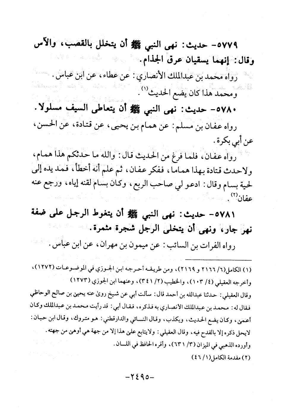 5779 - حَدِيث: نهى النَّبِي - صلى الله عَلَيْهِ وَسلم - أَن يتخيل بالقصب، والآس وَقَالَ: إنَّهُمَا يسقيان عرق الجذام. رَوَاهُ مُحَمَّد بن عبد الْملك الْأنْصَارِيّ: عَن عَطاء، عَن أبن عَبَّاس. وَمُحَمّد هَذَا كَانَ يضع الحَدِيث.