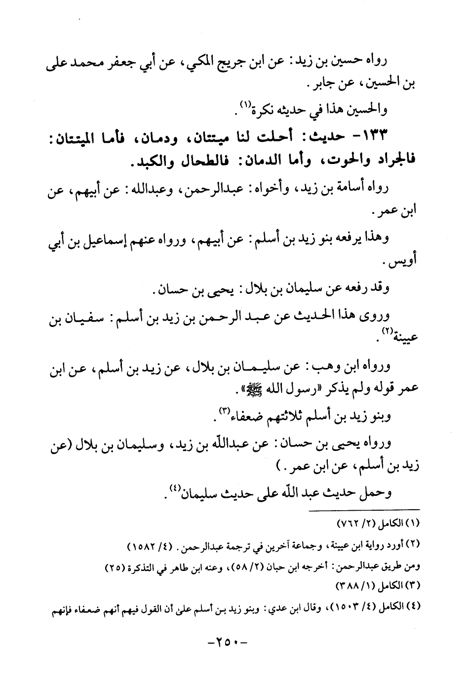 133 - حَدِيث: أحلّت لنا ميتَتَانِ، وَدَمَانِ، فَأَما الْمَيتَتَانِ: فالجراد والحوت، وَأما الدمَان: فالطحال والكبد. رَوَاهُ أُسَامَة بن زيد، وأخواه: عبد الرَّحْمَن، وعبد الله: عَن أَبِيهِم، عَن ابْن عمر. وَهَذَا يرفعهُ بَنو زيد بن أسلم: عَن أَبِيهِم، وَرَوَاهُ عَنْهُم إِسْمَاعِيل بن أبي أويس. وَقد رَفعه عَن سُلَيْمَان بن بِلَال: يحيى بن حسان. وروى هَذَا الحَدِيث عَن عبد الرَّحْمَن بن زيد بن أسلم: سُفْيَان بن عُيَيْنَة. وَرَوَاهُ ابْن وهب: عَن سُلَيْمَان بن بِلَال، عَن زيد بن أسلم، عَن ابْن عمر قَوْله وَلم يذكر " رَسُول الله ". وَبَنُو زيد بن أسلم ثَلَاثَتهمْ ضعفاء. وَرَوَاهُ يحيى بن حسان: عَن عبد الله بن زيد، وَسليمَان بن بِلَال (عَن زيد بن أسلم، عَن ابْن عمر.) وَحمل حَدِيث عبد الله على حَدِيث سُلَيْمَان.