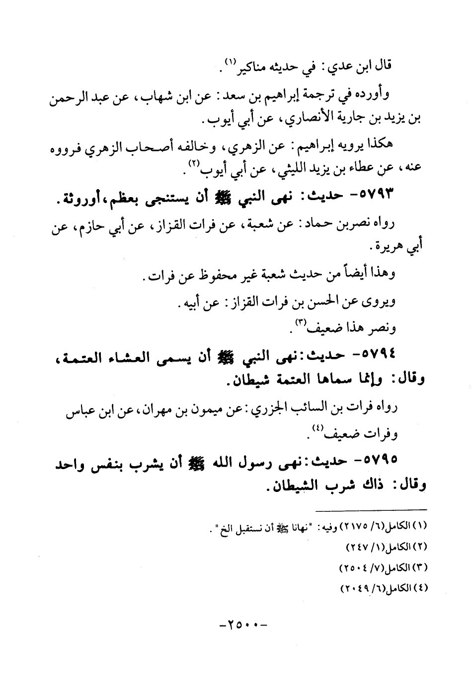 5793 - حَدِيث: نهى النَّبِي - صلى الله عَلَيْهِ وَسلم - أَن يستنجي بِعظم، أَو روثه. رَوَاهُ نصر بن حَمَّاد: عَن شُعْبَة، عَن فرات الْقَزاز، عَن أبي حَازِم، عَن أبي هُرَيْرَة. وَهَذَا أَيْضا من حَدِيث شُعْبَة غير مَحْفُوظ عَن فرات. ويروي عَن الْحسن بن فرات الْقَزاز: عَن أَبِيه. وَنصر هَذَا ضَعِيف.
