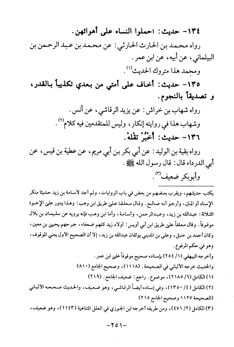 134 - حَدِيث: احملوا النِّسَاء على أهوائهن. رَوَاهُ مُحَمَّد بن الْحَارِث الْحَارِثِيّ: عَن مُحَمَّد بن عبد الرَّحْمَن بن الْبَيْلَمَانِي، عَن أَبِيه، عَن ابْن عمر. وَمُحَمّد هَذَا مَتْرُوك الحَدِيث.