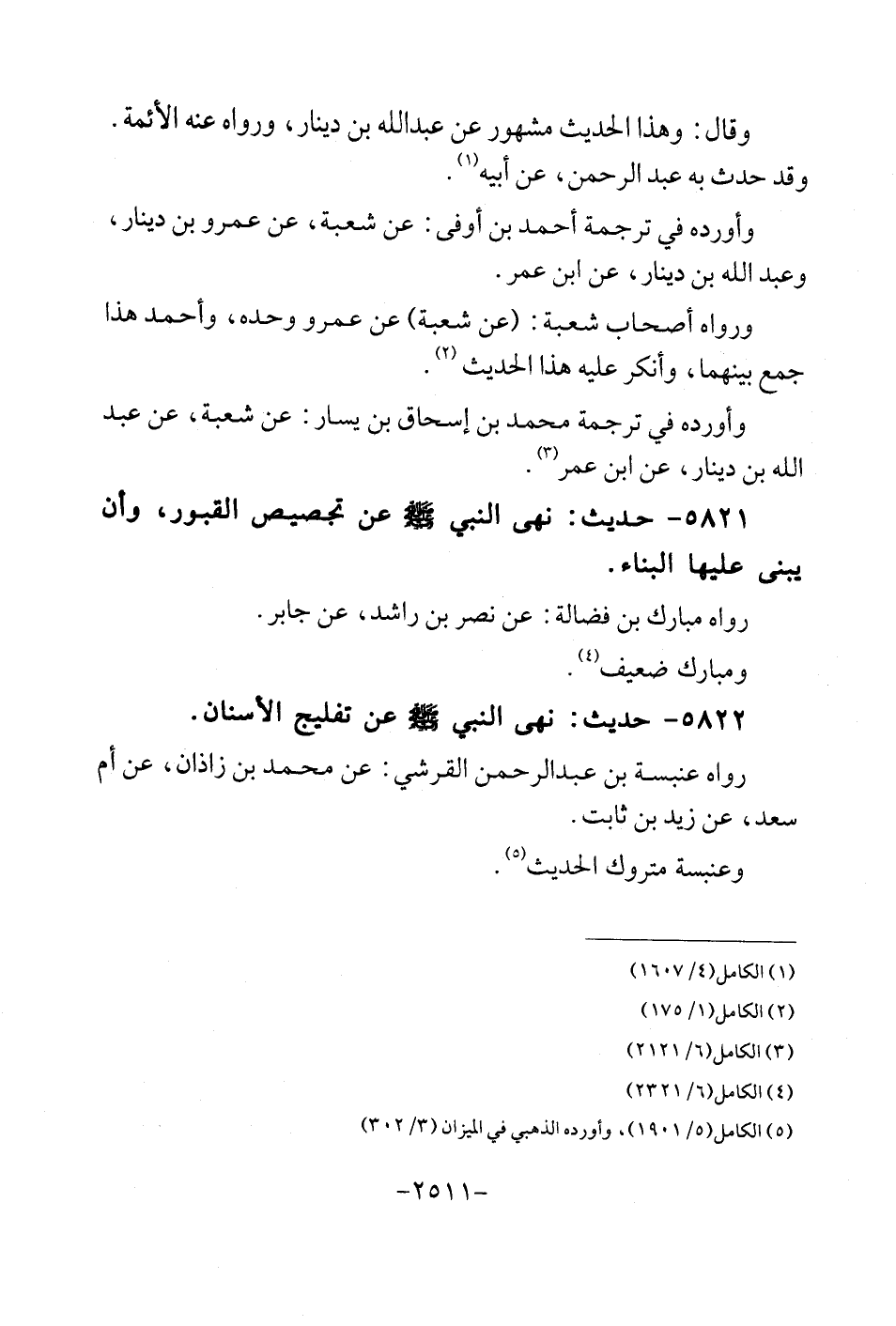 5821 - حَدِيث: نهى النَّبِي - صلى الله عَلَيْهِ وَسلم - عَن تجصيص الْقُبُور، وَأَن يَبْنِي عَلَيْهَا الْبناء. رَوَاهُ مبارك بن فضَالة: عَن نصر بن رَاشد، عَن جَابر. ومبارك ضَعِيف.