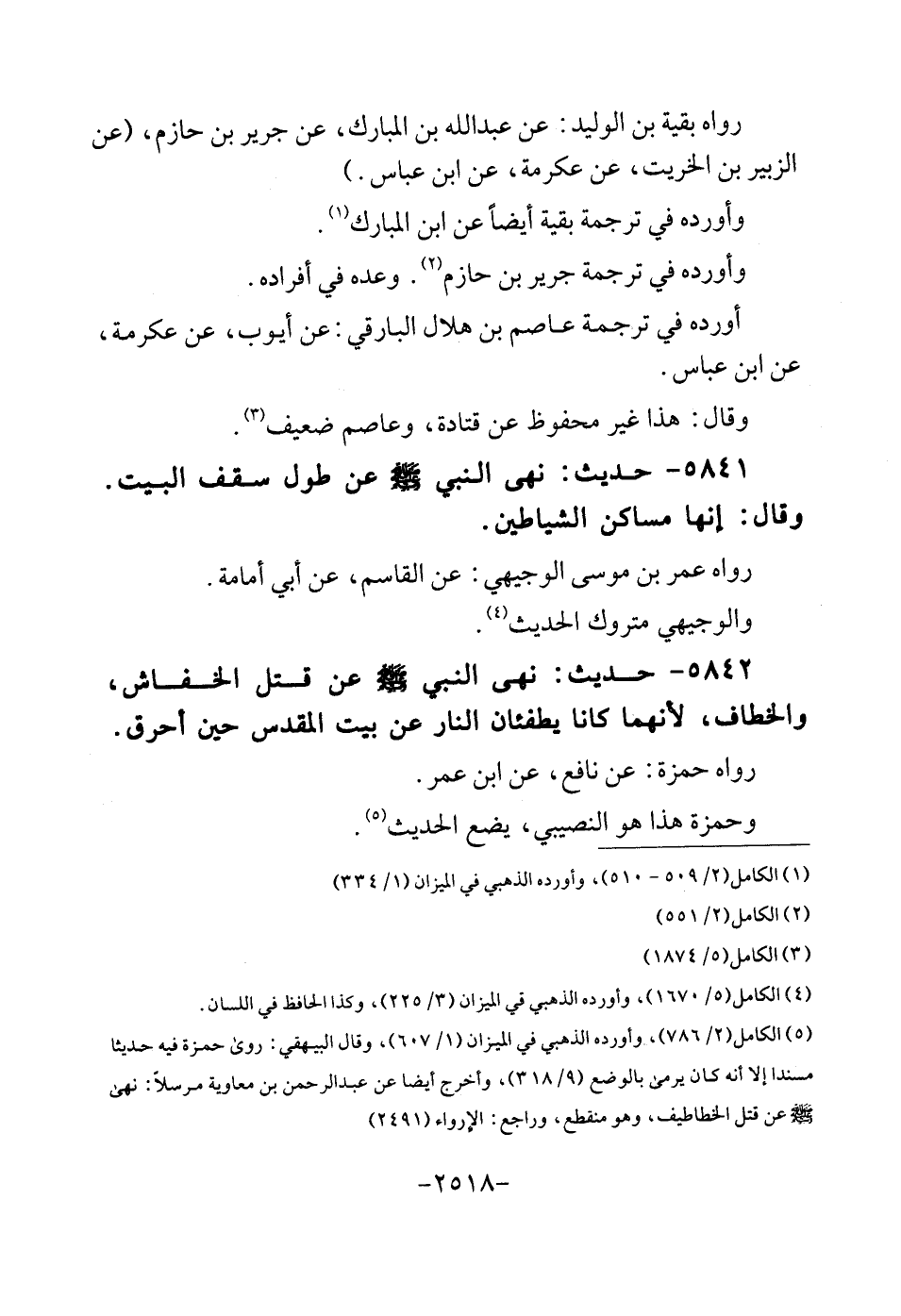 5842 - حَدِيث: نهى النَّبِي - صلى الله عَلَيْهِ وَسلم - عَن قتل الخفاش، والخطاف، لِأَنَّهُمَا يطفئان النَّار عَن بَيت الْمُقَدّس حِين أحرق. رَوَاهُ حَمْزَة: عَن نَافِع، عَن ابْن عمر. وَحَمْزَة هَذَا هُوَ النصيبي، يضع الحَدِيث.