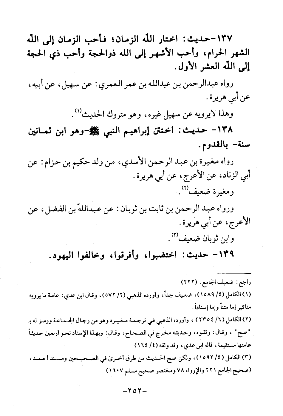 138 - حَدِيث: اختتن إِبْرَاهِيم النَّبِي - وَهُوَ ابْن ثَمَانِينَ سنة - بالقدوم. رَوَاهُ مُغيرَة بن عبد الرَّحْمَن الْأَسدي، من ولد حَكِيم بن حزَام، عَن أبي الزِّنَاد، عَن الْأَعْرَج، عَن أبي هُرَيْرَة. ومغيرة ضَعِيف. وَرَوَاهُ عبد الرَّحْمَن بن ثَابت بن ثَوْبَان: عَن عبد الله بن الْفضل، عَن الْأَعْرَج، عَن أبي هُرَيْرَة. وأبن ثَوْبَان ضَعِيف.