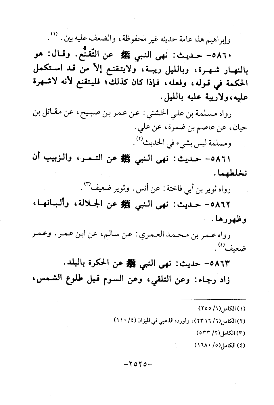5860 - حَدِيث: نهى النَّبِي - صلى الله عَلَيْهِ وَسلم - عَن التّقنٌ ع. وَقَالَ: هُوَ بِالنَّهَارِ شهرة، وبالليل رِيبَة، وَلَا يتقنع إلاّ من قد اسْتكْمل الْحِكْمَة فِي قَوْله، فعله، فَإِذا كَانَ كَذَلِك؛ فليتقنع لِأَنَّهُ لاشهرة عَلَيْهِ، وَلَا رِيبَة عَلَيْهِ بِاللَّيْلِ. رَوَاهُ مسلمة بن عَليّ الْخُشَنِي: عَن عمر بن صبيح، عَن مقَاتل بن حَيَّان عَن عَاصِم بن ضَمرَة، عَن عَليّ. ومسلمة لَيْسَ بِشَيْء فِي الحَدِيث.