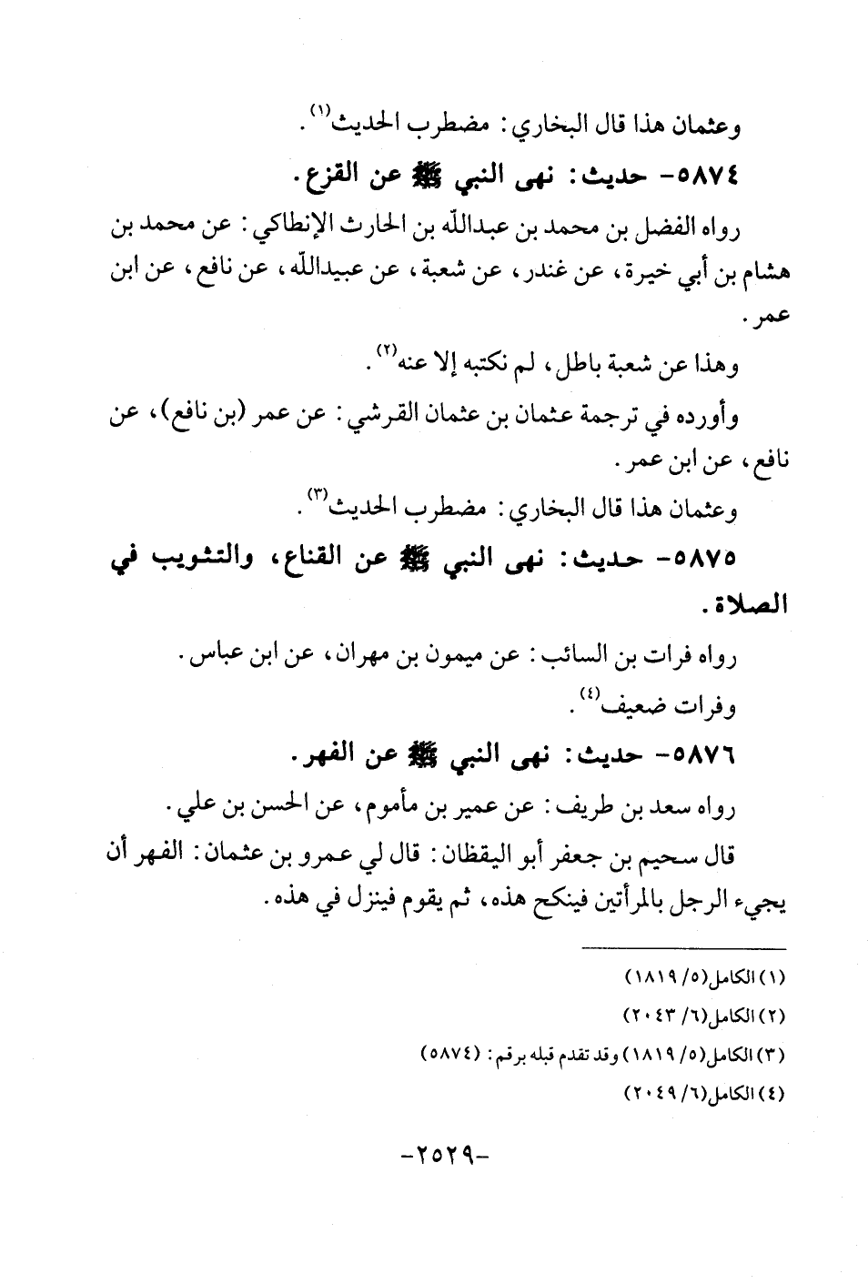 5874 - حَدِيث: نهى النَّبِي - صلى الله عَلَيْهِ وَسلم - عَن القزع. رَوَاهُ الْفضل بن مُحَمَّد بن عبد الله بن الْحَارِث الإنطاكي: عَن مُحَمَّد بن هِشَام بن أبي خيرة، عَن غنْدر، عَن شُعْبَة، عَن عبيد الله، نَافِع، عَن ابْن عمر. وَهَذَا عَن شُعْبَة بَاطِل، لم نَكْتُبهُ إِلَّا عَنهُ. وَأوردهُ فِي تَرْجَمَة عُثْمَان بن عَفَّان الْقرشِي: عَن عمر (بن نَافِع) ، عَن نَافِع، عَن ابْن عمر وَعُثْمَان هَذَا قَالَ البُخَارِيّ: مُضْطَرب الحَدِيث.