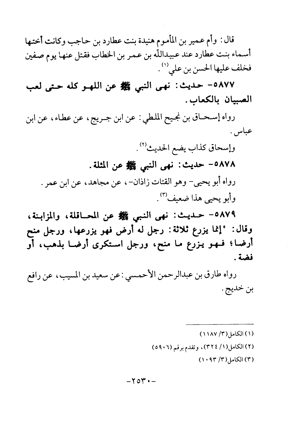 5877 - حَدِيث: نهى النَّبِي عَن اللَّهْو كُله حَتَّى لعب الصّبيان بالكعاب. رَوَاهُ إِسْحَاق بن نجيح الْمَلْطِي: عَن أبن جريج، عَن عَطاء، عَن ابْن عَبَّاس. وَإِسْحَاق كَذَّاب يضع الحَدِيث.