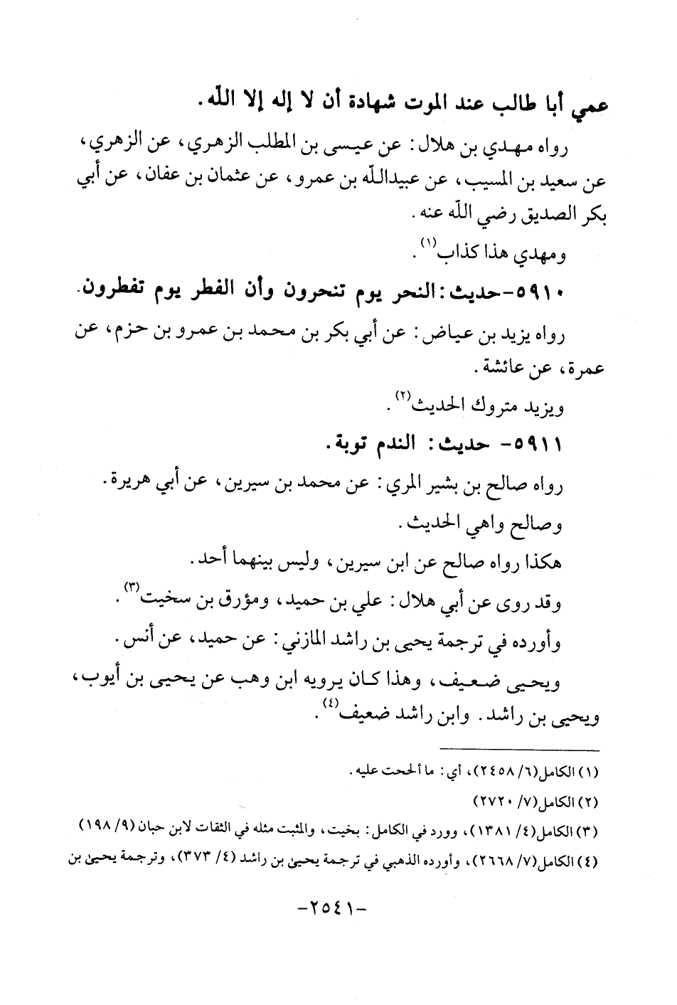5911 - حَدِيث: النَّدَم تَوْبَة. رَوَاهُ صَالح بن بشير المري: عَن مُحَمَّد بن سِيرِين، عَن أبي هُرَيْرَة. وَصَالح واهي الحَدِيث. هَكَذَا رَوَاهُ صَالح عَن ابْن سِيرِين، وَلَيْسَ بَينهمَا أحد. وَقد روى عَن أبي هِلَال: عَليّ بن حميد، ومؤرق بن سخيت. وَأوردهُ فِي تَرْجَمَة يحيى بن رَاشد الْمَازِني: عَن حميد، عَن أنس. وَيحيى ضَعِيف، وَهَذَا كَانَ يرويهِ ابْن وهب عَن يحيى بن أَيُّوب، وَيحيى بن رَاشد. وَابْن رَاشد ضَعِيف.