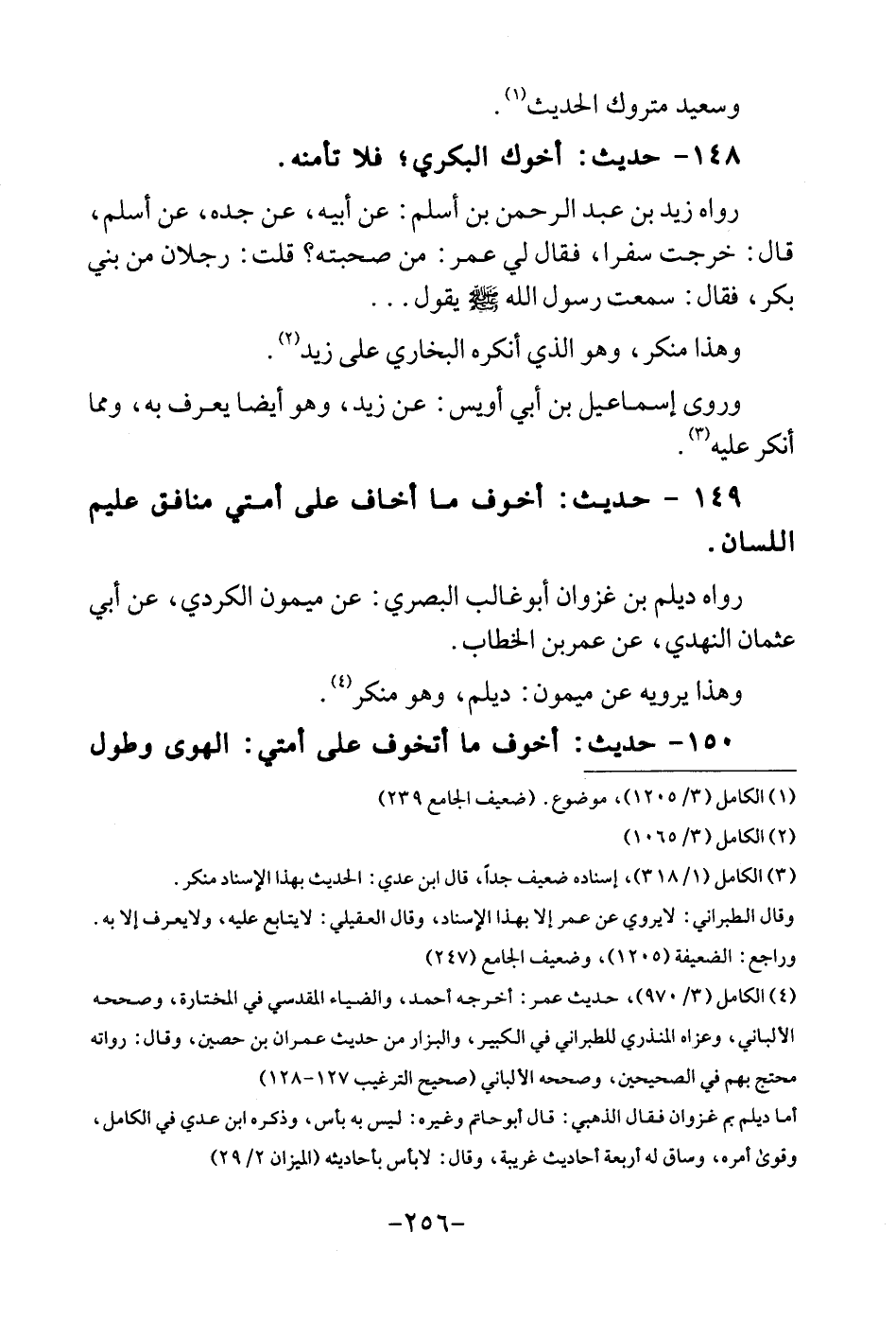 148 - حَدِيث. أَخُوك الْبكْرِيّ؟ فَلَا تأمنه. رَوَاهُ زيد بن عبد الرَّحْمَن بن أسلم: عَن أَبِيه، عَن جده، عَن أسلم، قَالَ: خرجت سفرا، فَقَالَ لي عمر: من صحبته؟ قلت: رجلَانِ من بني بكر، فَقَالَ: سَمِعت رَسُول الله! يَقُول ... وَهَذَا مُنكر، وَهُوَ الَّذِي أنكرهُ البُخَارِيّ على زيد. وروى إِسْمَاعِيل بن أَبى أويس: عَن زيد، وَهُوَ أَيْضا يعرف بِهِ، وَمِمَّا أنكر عَلَيْهِ.