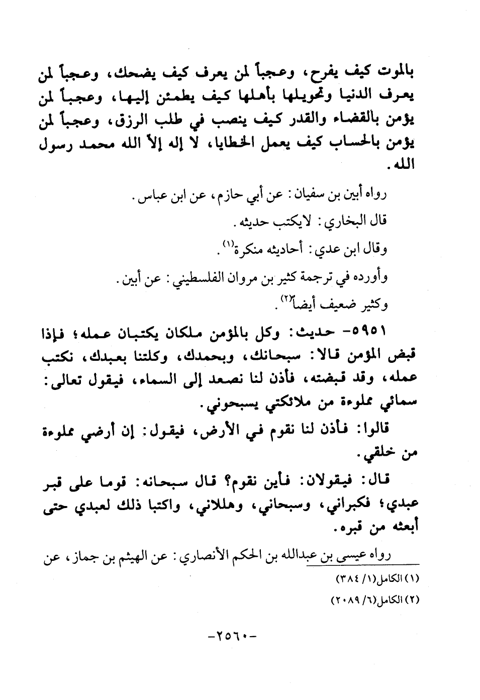 بِالْمَوْتِ كَيفَ يفرح، وعجباً لمن يعرف كَيفَ يضْحك، وعجباً لمن يعرف الدُّنْيَا وَتَحْوِيلهَا بِأَهْلِهَا كَيفَ يطمئن إِلَيْهَا، وعجباً لمن يُؤمن بِالْقضَاءِ وَالْقدر كَيفَ ينصب فِي طلب الرزق، وعجباً لمن يُؤمن بِالْحِسَابِ كَيفَ يعْمل الْخَطَايَا، لَا إِلَه إلاّ الله مُحَمَّد رَسُول الله. رَوَاهُ أبين بن سُفْيَان: عَن أبي حَازِم، عَن أبن عَبَّاس. قَالَ البُخَارِيّ: لَا يكْتب حَدِيثه. وَقَالَ ابْن عدي: أَحَادِيثه مُنكرَة. وَأوردهُ فِي تَرْجَمَة كثير بن مَرْوَان الفلسطيني: عَن أبين. وَكثير ضَعِيف أَيْضا.
