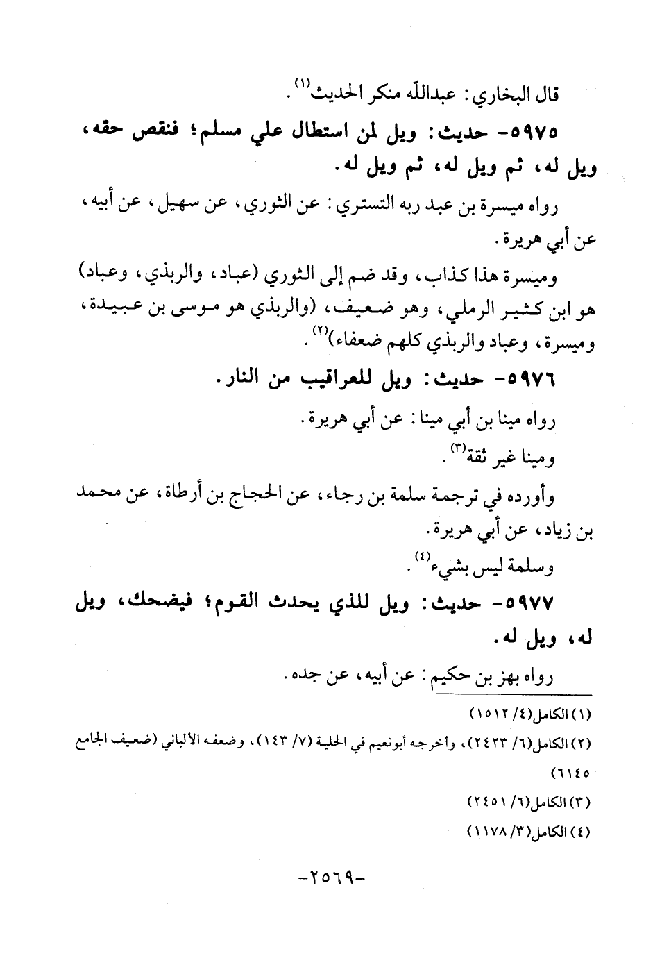 5975 - حَدِيث: ويل لمن استطال عَليّ مُسلم؛ فنقص حَقه، ويل لَهُ ثمَّ ويل لَهُ، ثمَّ ويل لَهُ. رَوَاهُ ميسرَة بن عبد ربه التسترِي: عَن الثَّوْريّ، عَن سُهَيْل، عَن أَبِيه عَن أبي هُرَيْرَة. وميسرة هَذَا كَذَّاب، وَقد ضم إِلَى الثَّوْريّ (عباد والربذي، وَعباد؟) هُوَ أبن كثير الرَّمْلِيّ، وَهُوَ ضَعِيف، (والربذي هُوَ مُوسَى بن عُبَيْدَة، وميسرة، وَعباد الربذي كلهم ضعفاء) .