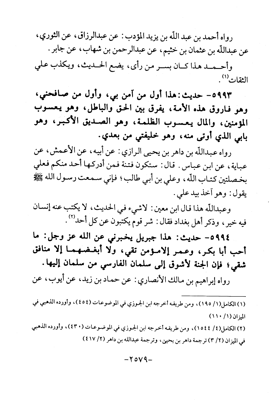 5993 - حَدِيث: هَذَا أول من آمن بِي، وَأول من صَافَحَنِي، وهوا فاروق هَذِه الْأمة، يفرق بَين الْحق وَالْبَاطِل، وَهُوَ يعسوب الْمُؤمنِينَ، وَالْمَال يعسوب الظلمَة، وَهُوَ الصّديق الْأَكْبَر، وَهُوَ بَابي الَّذِي أُوتى مِنْهُ، وَهُوَ خليفتي من بعدِي. رَوَاهُ عبد الله بن داهر بن يحيى الرَّازِيّ: عَن أَبِيه، عَن الْأَعْمَش، عَن عبابة، عَن ابْن عَبَّاس. قَالَ: سَتَكُون فتْنَة فَمن أدْركهَا أحد مِنْكُم فعلي بخصلتين كتاب الله، وَعلي بن أبي طَالب؛ فَإِنِّي سَمِعت رَسُول الله - صلى الله عَلَيْهِ وَسلم - يَقُول: وَهُوَ آخذ بيد عَليّ. وَعبد الله هَذَا قَالَ ابْن معِين: لَا شَيْء فِي الحَدِيث لَا يكْتب عَنهُ إِنْسَان فِيهِ خير، وَذكر أهل بَغْدَاد فَقَالَ: شَرّ قوم يَكْتُبُونَ عَن كل أحد.