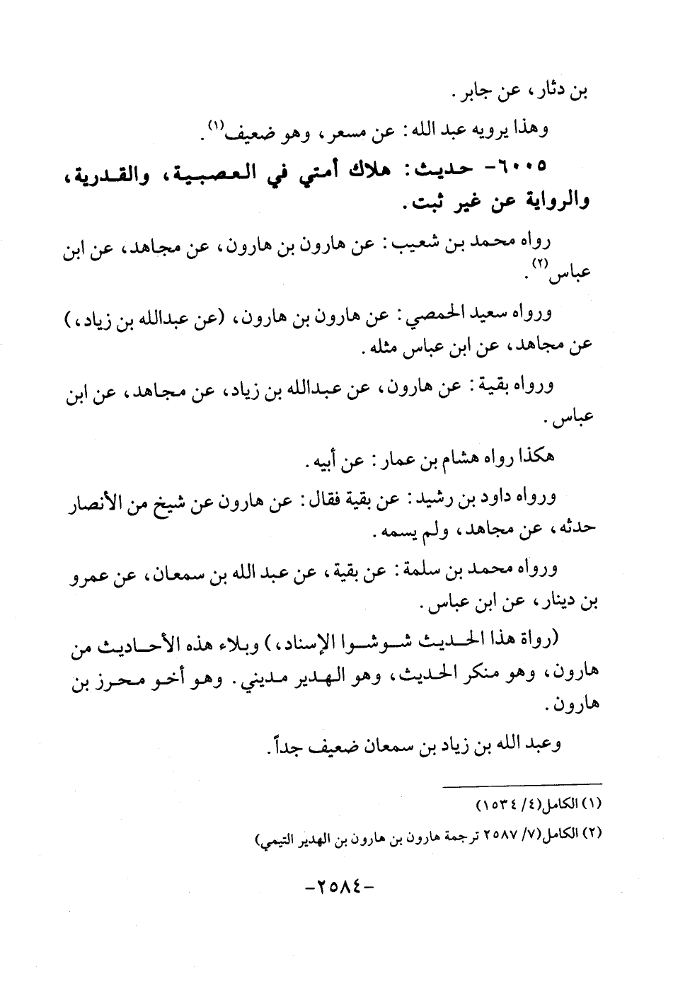 6005 - حَدِيث: هَلَاك أمتِي فِي العصبية، والقدرية، وَالرِّوَايَة عَن غير ثَابت. رَوَاهُ مُحَمَّد بن شُعَيْب: عَن هَارُون بن هَارُون، عَن مُجَاهِد، عَن ابْن عَبَّاس. وَرَوَاهُ سعيد الْحِمصِي: عَن هَارُون بن هَارُون، (عَن عبد الله بن زِيَاد) ، عَن مُجَاهِد، عَن ابْن عَبَّاس مثله. وَرَوَاهُ بَقِيَّة: عَن هَارُون، عَن عبد الله بن زِيَاد، عَن مُجَاهِد، عَن ابْن عَبَّاس. هَكَذَا رَوَاهُ هِشَام بن عمار: عَن أَبِيه. وَرَوَاهُ دَاوُد بن رشيد: عَن بَقِيَّة فَقَالَ: عَن هَارُون عَن شيخ من الْأَنْصَار حَدثهُ، عَن مُجَاهِد، وَلم يسمه. وَرَوَاهُ مُحَمَّد بن سَلمَة: عَن بَقِيَّة، عَن عبد الله بن سمْعَان، عَن عَمْرو بن دِينَار، عَن ابْن عَبَّاس. (رُوَاة هَذَا الحَدِيث شوشوا الْإِسْنَاد) ، وبلاء هَذِه الْأَحَادِيث من هَارُون، وَهُوَ مُنكر الحَدِيث، وَهُوَ الهدير مديني، وَهُوَ أَخُو مُحرز بن هَارُون. وَعبد الله بن زِيَاد بن سمْعَان ضَعِيف جدا.