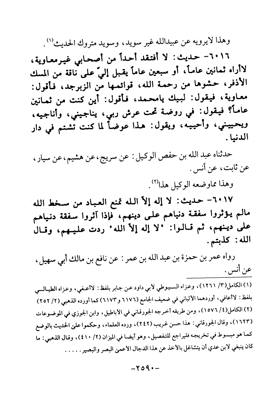 6016 - حَدِيث: لَا أفتقد أحدا من أَصْحَابِي غير مُعَاوِيَة، لَا أرَاهُ ثَمَانِينَ عَاما، أَو سبعين عَاما يقبل إلىّ على نَاقَة من الْمسك الأذفر، حشوها من رَحْمَة الله، قَوَائِمهَا من الزبر جد، فَأَقُول: مُعَاوِيَة، فَيَقُول: لبيْك يَا مُحَمَّد، فَأَقُول: أَيْن كنت من ثَمَانِينَ عَاما؟ فَيَقُول: فِي رَوْضَة تَحت عرش رَبِّي، يناجيني، وَأَنا جيه، ويحيني، وأحييه، وَيَقُول: هَذَا عوضا لما كنت تَشْتُم فِي دَار الدُّنْيَا. حدّثنَاهُ عبد الله بن حَفْص الْوَكِيل: عَن سُرَيج، عَن هشيم، عَن سيار، عَن ثَابت، عَن أنس. وَهَذَا مِمَّا وَضعه الْوَكِيل هَذَا.