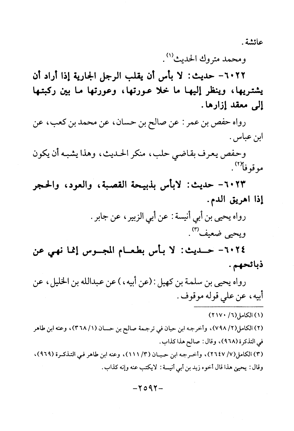 6022 - حَدِيث: لَا بَأْس أَن يقلب الرجل الْجَارِيَة إِذا أَرَادَ أَن يَشْتَرِيهَا وَينظر إِلَيْهَا مَا خلا عورتها، وعورتها مَا بَين ركبتها إِلَى معقد إزَارهَا. رَوَاهُ حَفْص بن عمر: عَن صَالح بن حسان، عَن مُحَمَّد بن كَعْب عَن ابْن عَبَّاس. وَحَفْص يعرف بقاضي حلب، مُنكر الحَدِيث، وَهَذَا يشبه أَن يكون مَوْقُوفا.
