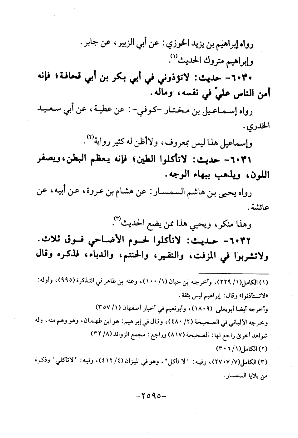 6031 - حَدِيث: لَا تَأْكُلُوا الطين؛ فَإِنَّهُ يعظم الْبَطن، ويصفر اللَّوْن، وَيذْهب ببهاء الْوَجْه. رَوَاهُ يحيى بن هَاشم السمسار: عَن هِشَام بن عُرْوَة، عَن أَبِيه، عَن عَائِشَة. وَهَذَا مُنكر، وَيحيى هَذَا مِمَّن يضع الحَدِيث.