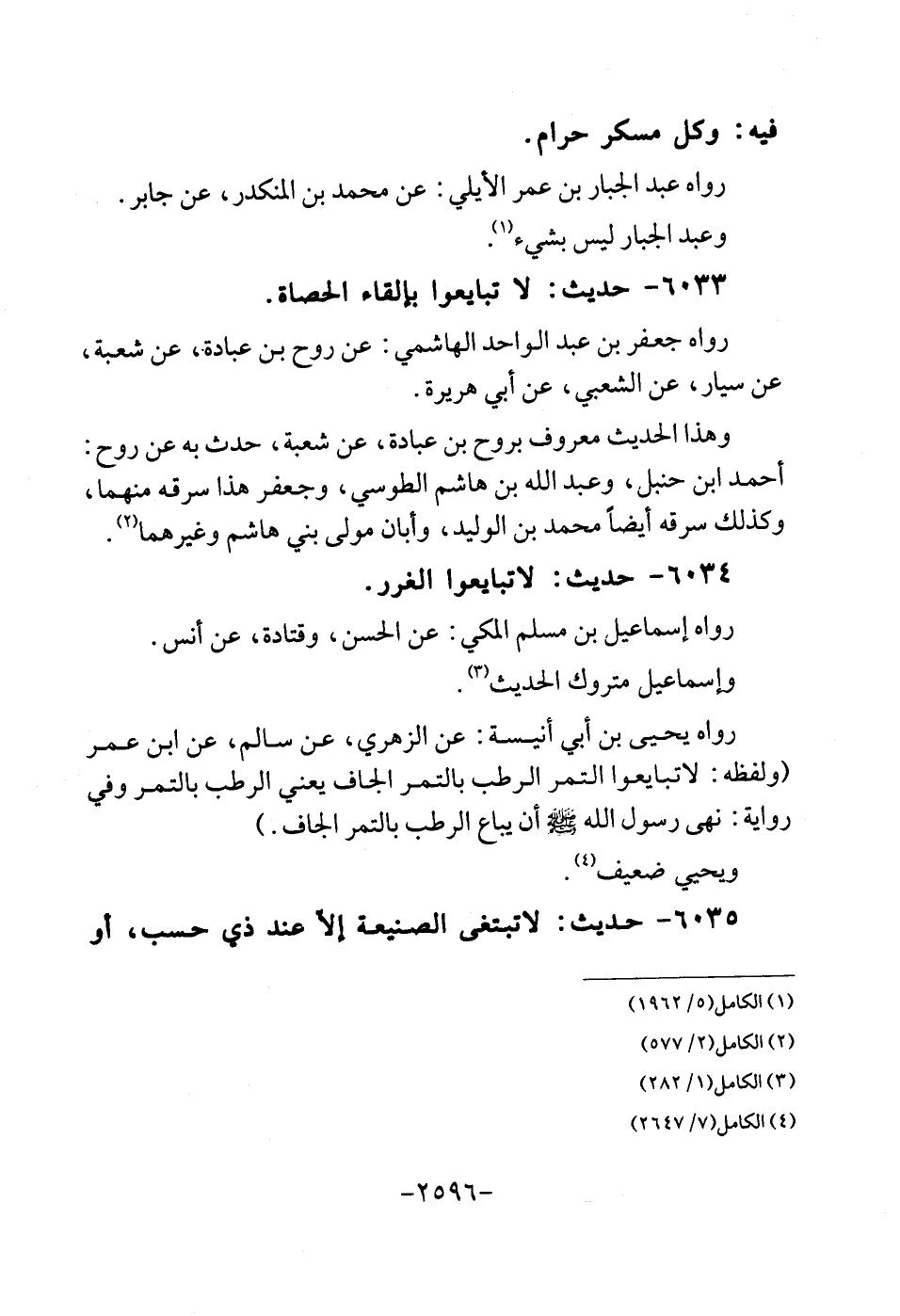 6033 - حَدِيث: لَا تبايعوا بإلقاء الْحَصَاة. رَوَاهُ جَعْفَر بن عبد الْوَاحِد الْهَاشِمِي: عَن روح بن عبَادَة، عَن شُعْبَة، عَن سيار عَن الشّعبِيّ، عَن أبي هُرَيْرَة. وَهَذَا الحَدِيث مَعْرُوف بِروح بن عبَادَة، عَن شُعْبَة، حدث بِهِ عَن روح: أَحْمد ابْن حَنْبَل، وعبد الله بن هَاشم الطوسي، وجعفر هَذَا سَرقَة مِنْهُمَا، وَكَذَلِكَ سَرقَة أَيْضا مُحَمَّد بن الْوَلِيد، وَأَبَان مولى بني هَاشم وَغَيرهمَا.