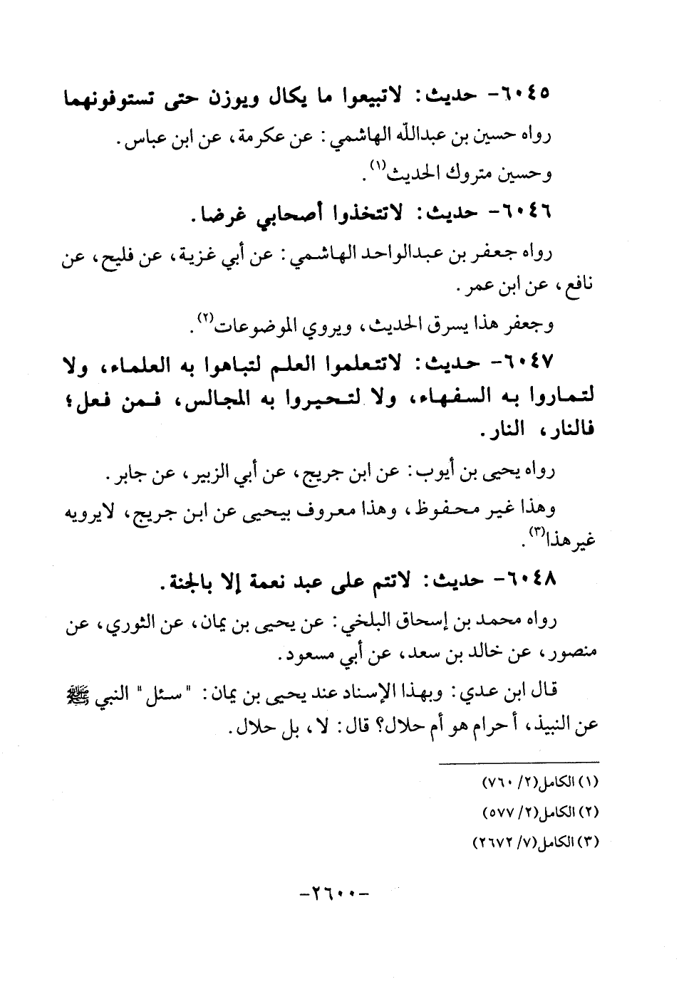 6045 - حَدِيث: لاتبيعوا مَا يُكَال ويوزن حَتَّى تستوفونهما. رَوَاهُ حُسَيْن بن عبد الله الْهَاشِمِي ك عَن عِكْرِمَة عَن أبن عَبَّاس. وحسين مَتْرُوك الحَدِيث.