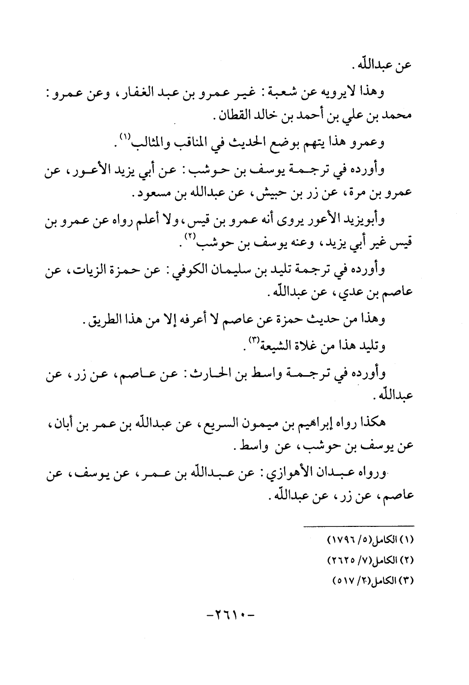 عَن عبد الله. وَهَذَا لَا يرويهِ عَن شُعْبَة: غير عَمْرو بن عبد الْغفار وَعَن عَمْرو: مُحَمَّد بن عَليّ بن أَحْمد بن خَالِد الْقطَّان. وَعَمْرو هَذَا يتهم بِوَضْع الحَدِيث فِي المناقب والمثالب. وَأوردهُ فِي تَرْجَمَة يُوسُف بن حَوْشَب: عَن أبي يزِيد الْأَعْوَر، عَن عَمْرو بن مرّة، عَن زر بن حُبَيْش، عَن عبد الله بن مَسْعُود. وَأَبُو يزِيد الْأَعْوَر يرْوى أَنه عَمْرو بن قيس، وَلَا أعلم رَوَاهُ عَن عَمْرو بن قيس غير أبي يزِيد، وَعنهُ يُوسُف بن حَوْشَب. وَأوردهُ فِي تَرْجَمَة تليد بن سُلَيْمَان الْكُوفِي: عَن حَمْزَة الزيات، عَن عَاصِم بن عدي، عَن عبد الله. وَهَذَا من حَدِيث حَمْزَة عَن عَاصِم لَا أعرفهُ إِلَّا من هَذَا الطَّرِيق. وَتَلِيدُ هَذَا من غلاة الشِّيعَة. وَأوردهُ فِي تَرْجَمَة وَاسِط بن الْحَارِث: عَن عَاصِم عَن زر، عَن عبد الله. هَكَذَا رَوَاهُ إِبْرَاهِيم بن مَيْمُون السَّرِيع عَن عبد الله بن عمر بن أبان، عَن يُوسُف بن حَوْشَب، عَن وَاسِط. وَرَوَاهُ عَبْدَانِ الْأَهْوَازِي: عَن عبد الله بِمن عمر، عَن يُوسُف عَن عَاصِم عَن زر، عَن عبد الله.