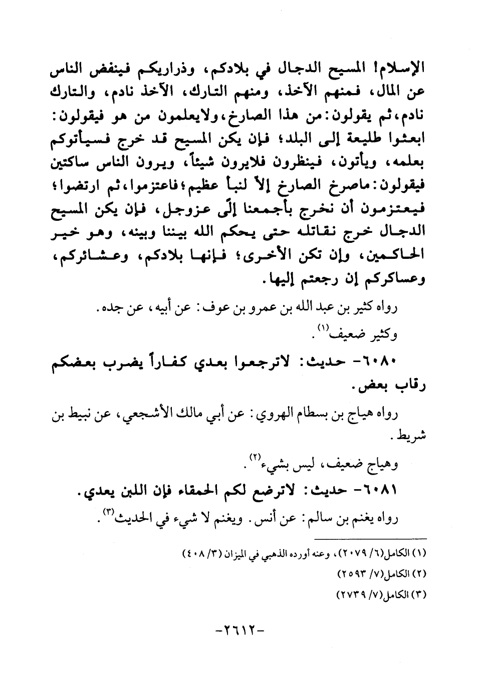 6080 - حَدِيث: لَا تراجعوا بعدِي كفَّارًا يضْرب بَعْضكُم رِقَاب بعض. رَوَاهُ هياج بن بسطَام الْهَرَوِيّ: عَن أبي مَالك الْأَشْجَعِيّ، عَن نبيط بن شريط. وَهياج ضَعِيف. لَيْسَ بِشَيْء.