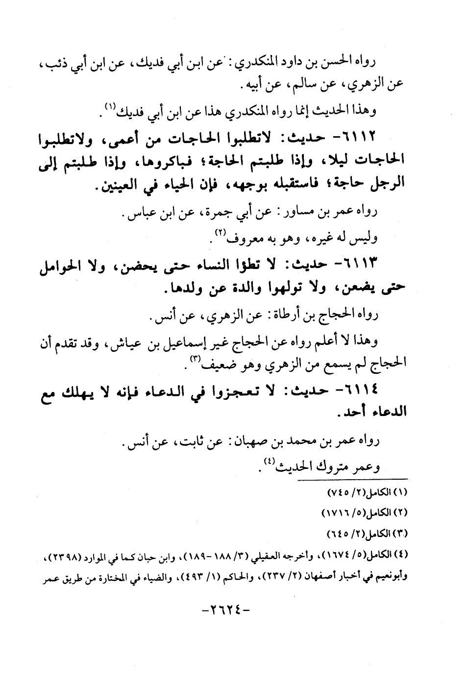 6112 - حَدِيث: لَا تَطْلُبُوا الْحَاجَات من أعمى، وَلَا تَطْلُبُوا الْحَاجَات لَيْلًا، وَإِذا طلبتم الْحَاجة؛ فباكروها، وَإِذا طلبتم إِلَى الرجل حَاجَة ح فَاسْتَقْبلهُ بِوَجْهِهِ، فَإِذا الْحيَاء فِي الْعَينَيْنِ. رَوَاهُ عمر بن مساور: عَن أبي جَمْرَة، عَن ابْن عَبَّاس. وَلَيْسَ لَهُ غَيره، وَهُوَ بِهِ مَعْرُوف.