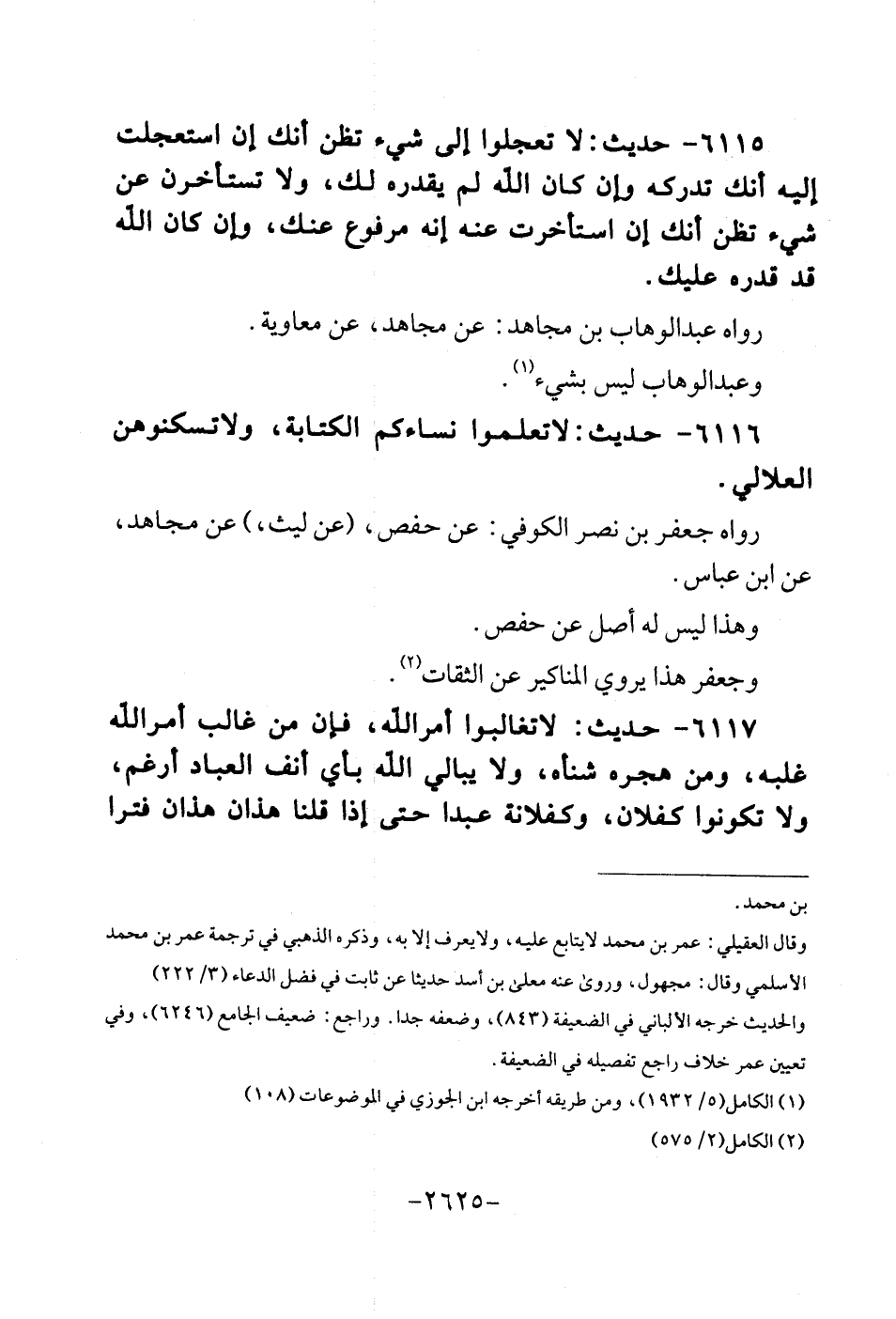 6116 - حَدِيث: لَا تعلمُوا نساءكم الْكِتَابَة، وتسكنوهن العلالي. رَوَاهُ جَعْفَر بن نصر الْكُوفِي: عَن حَفْص، (عَن لَيْث) عَن مُجَاهِد، عَن أبن عَبَّاس. وَهَذَا لَيْسَ لَهُ أصل عَن حَفْص. وجعفر هَذَا يروي الْمَنَاكِير عَن الثِّقَات.