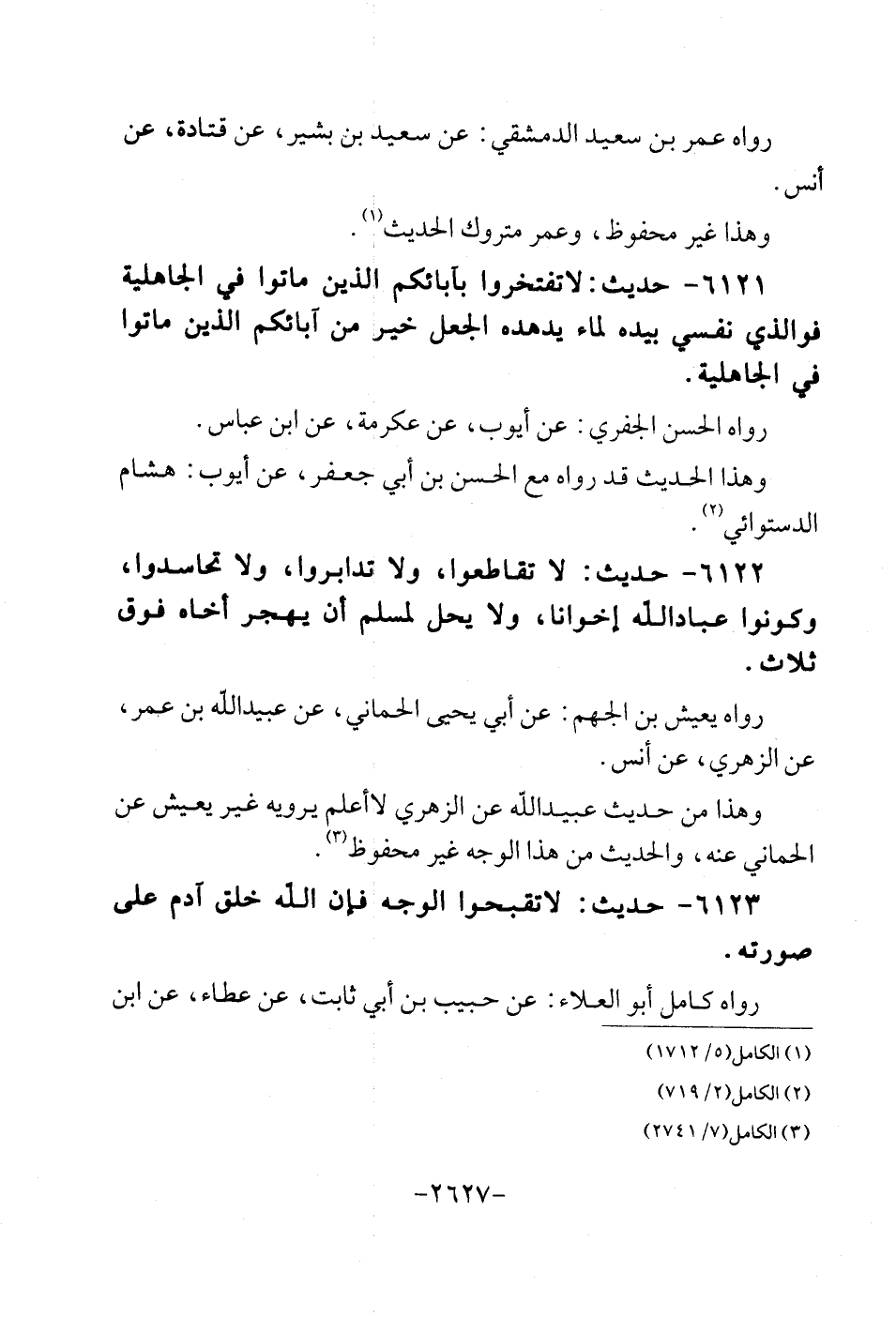 6121 - حَدِيث: لَا تفتخروا بِآبَائِكُمْ الَّذين مَاتُوا فِي الْجَاهِلِيَّة فوالذي نَفسِي بِيَدِهِ المَاء يدهده الْجعل خير من آبائكم الَّذين مَاتُوا فِي الْجَاهِلِيَّة. رَوَاهُ الْحسن الْجفْرِي: عَن أَيُّوب، عَن عِكْرِمَة، عَن ابْن عَبَّاس. وَهَذَا الحَدِيث قد رَوَاهُ مَعَ الْحسن بن أبي جَعْفَر، عَن أَيُّوب: هِشَام الدستوَائي.