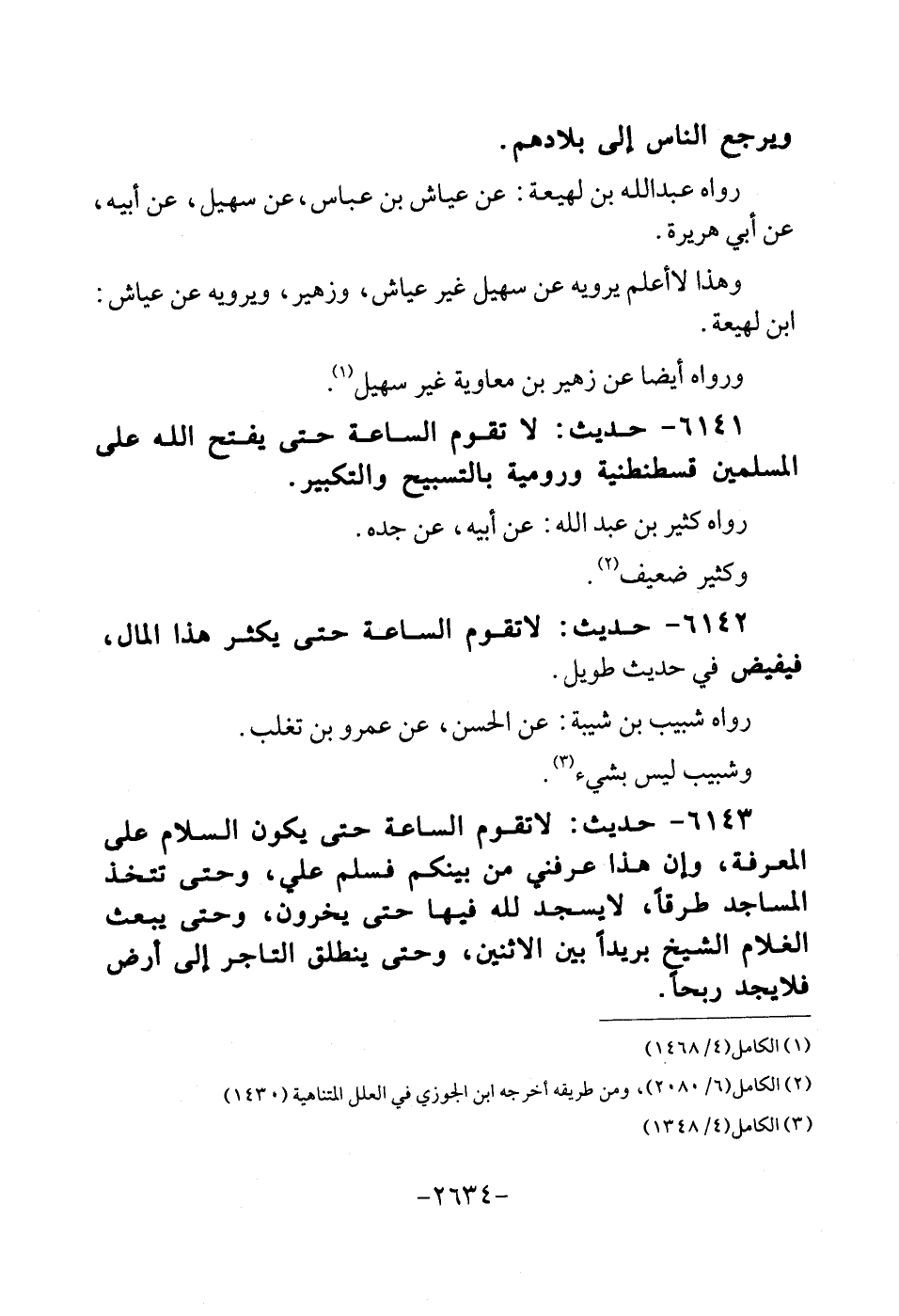 6141 - حَدِيث: لَا تقوم السَّاعَة حَتَّى يفتح الله على الْمُسلمين قسطنطينية ورومية بالتسبيح وَالتَّكْبِير. رَوَاهُ كثير بن عبد الله: عَن أَبِيه، عَن جده. وَكثير ضَعِيف.