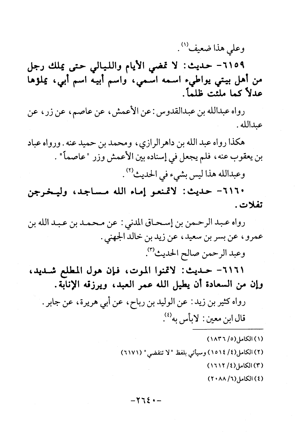 6159 - حَدِيث: لَا تمْضِي الْأَيَّام والليالي حَتَّى يملك رجل من أهل بَيْتِي يواطئ اسْمه اسْمِي، وَاسم أَبِيه اسْم أبي، يملؤها عدلا كَمَا ملئت ظلما. رَوَاهُ عبد الله بن عبد القدوس: عَن الْأَعْمَش، عَن عَاصِم، عَن زر، عَن عبد الله. هَكَذَا رَوَاهُ عبد الله بن داهر الرَّازِيّ، وَمُحَمّد بن حميد عَنهُ. وَرَوَاهُ عباد بن يَعْقُوب عَنهُ، فَلم يَجْعَل فِي إِسْنَاده بَين الْأَعْمَش وزر " عَاصِمًا ". وَعبد الله هَذَا لَيْسَ بِشَيْء فِي الحَدِيث.