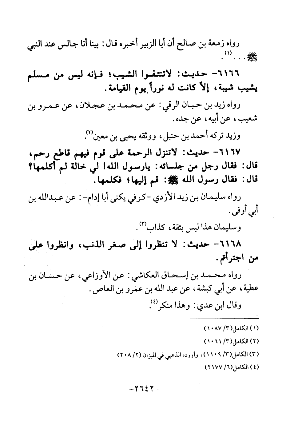 6166 - حَدِيث: لَا تنتفوا الشيب؛ فَإِنَّهُ لَيْسَ من مُسلم يشيب شيبَة، إِلَّا كَانَت لَهُ نورا يَوْم الْقِيَامَة. رَوَاهُ زيد بن حبَان الرقي: عَن مُحَمَّد بن عجلَان، عَن عَمْرو بن شُعَيْب، عَن أَبِيه، عَن جده. وَزيد تَركه أَحْمد بن حَنْبَل، ووثقة يحيى بن معِين.