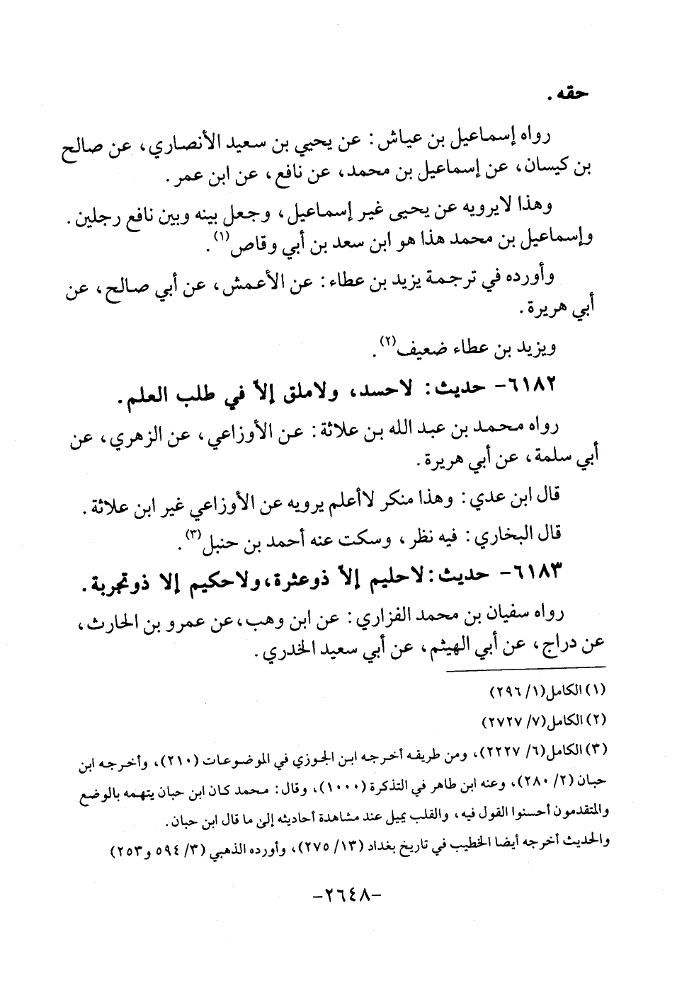 6182 - حَدِيث: لَا حسد، وَلَا ملق إِلَّا فِي طلب الْعلم. رَوَاهُ مُحَمَّد بن عبد الله بن علاثه: عَن الْأَوْزَاعِيّ، عَن الزُّهْرِيّ، عَن أبي سَلمَة، عَن أبي هُرَيْرَة. قَالَ ابْن عدي: وَهَذَا مُنكر لَا أعلم يرويهِ عَن الْأَوْزَاعِيّ غير ابْن علاثة. قَالَ البُخَارِيّ: فِيهِ نظر، وَسكت عَنهُ أَحْمد بن حَنْبَل.