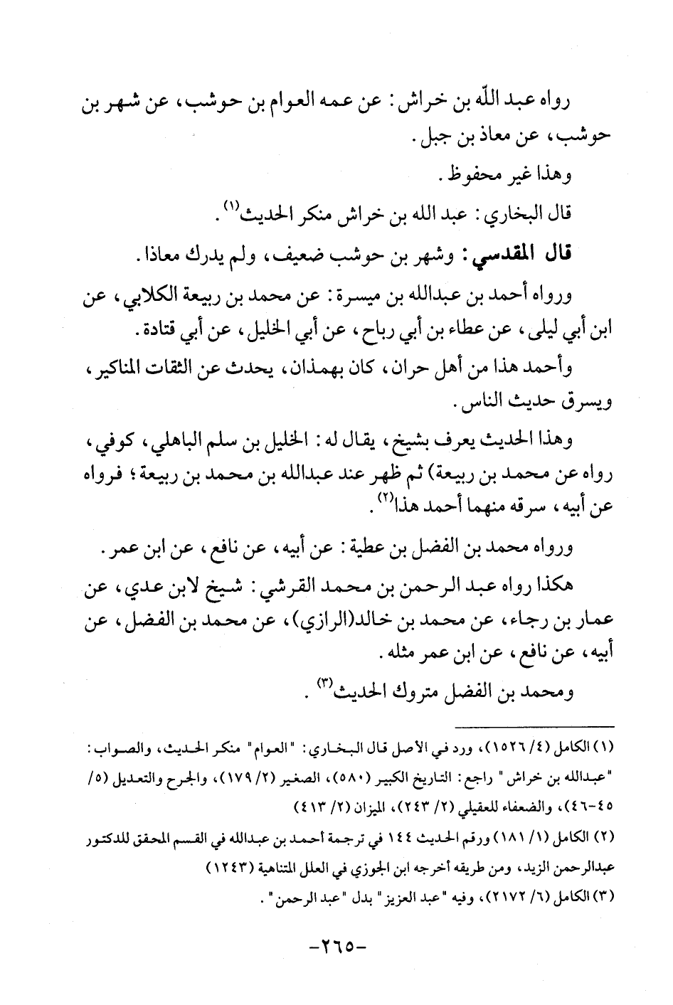 رَوَاهُ عبد الله بن خرَاش: عَن عَمه الْعَوام بن حَوْشَب، عَن شهر بن حَوْشَب، عَن معَاذ بن جبل. وَهَذَا غير مَحْفُوظ. قَالَ البُخَارِيّ: عبد الله بن خرَاش مُنكر الحَدِيث. قَالَ الْمَقْدِسِي: وَشهر بن حَوْشَب ضَعِيف، وَلم يدْرك معَاذًا. وَرَوَاهُ أَحْمد بن عبد الله بن ميسرَة: عَن مُحَمَّد بن ربيعَة الْكلابِي، عَن ابْن أبي ليلى، عَن عَطاء بن أبي رَبَاح، عَن أبي الْخَلِيل، عَن أبي قَتَادَة. وَأحمد هَذَا من أهل حران، كَانَ بهمذان، يحدث عَن الثِّقَات الْمَنَاكِير، وَيسْرق حَدِيث النَّاس. وَهَذَا الحَدِيث يعرف بشيخ، يُقَال لَهُ: الْخَلِيل بن سلم الْبَاهِلِيّ، كُوفِي، رَوَاهُ عَن مُحَمَّد بن ربيعَة) ثمَّ ظهر عِنْد عبد الله بن مُحَمَّد بن ربيعَة؛ فَرَوَاهُ عَن أَبِيه، سَرقه مِنْهُمَا أَحْمد هَذَا. وَرَوَاهُ مُحَمَّد بن الْفضل بن عَطِيَّة: عَن أَبِيه، عَن نَافِع، عَن ابْن عمر. هَكَذَا رَوَاهُ عبد الرَّحْمَن بن مُحَمَّد الْقرشِي: شيخ لِابْنِ عدي، عَن عمار بن رَجَاء، عَن مُحَمَّد بن خَالِد (الرَّازِيّ) ، عَن مُحَمَّد بن الْفضل، عَن أَبِيه، عَن نَافِع، عَن ابْن عمر مثله. وَمُحَمّد بن الْفضل مَتْرُوك الحَدِيث.