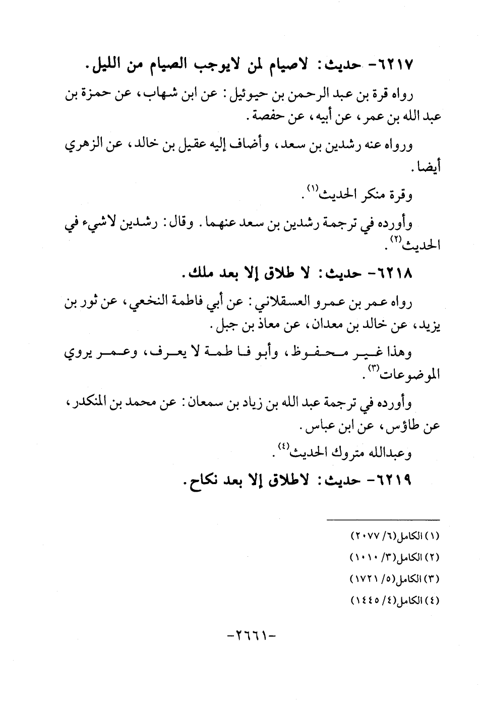 6217 - حَدِيث: لاصيام لمن لَا يُوجب الصّيام من اللَّيْل. رَوَاهُ قُرَّة بن عبد الرَّحْمَن بن حيوئيل: عَن ابْن شهَاب، عَن حَمْزَة بن عبد الله بن عمر، عَن أَبِيه، عَن حَفْصَة. وَرَوَاهُ عَنهُ رشدين بن سعد، وأضاف إِلَيْهِ عقيل بن خَالِد، عَن الزُّهْرِيّ أَيْضا. وقرة مُنكر الحَدِيث. وَأوردهُ فِي تَرْجَمَة رشدين بن سعد عَنْهُمَا. وَقَالَ: رشدين لَا شَيْء فِي الحَدِيث.