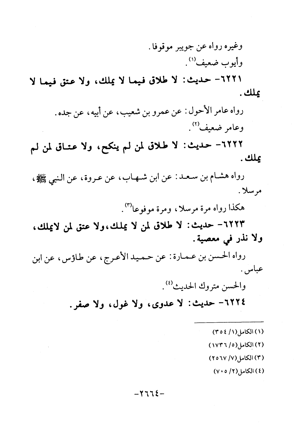 6221 - حَدِيث: لَا طَلَاق فِيمَا لَا يملك، وَلَا عتق فِيمَا لَا يملك. رَوَاهُ عَامر الْأَحول: عَن عَمْرو بن شُعَيْب، عَن أَبِيه، عَن جده. وعامر ضَعِيف.