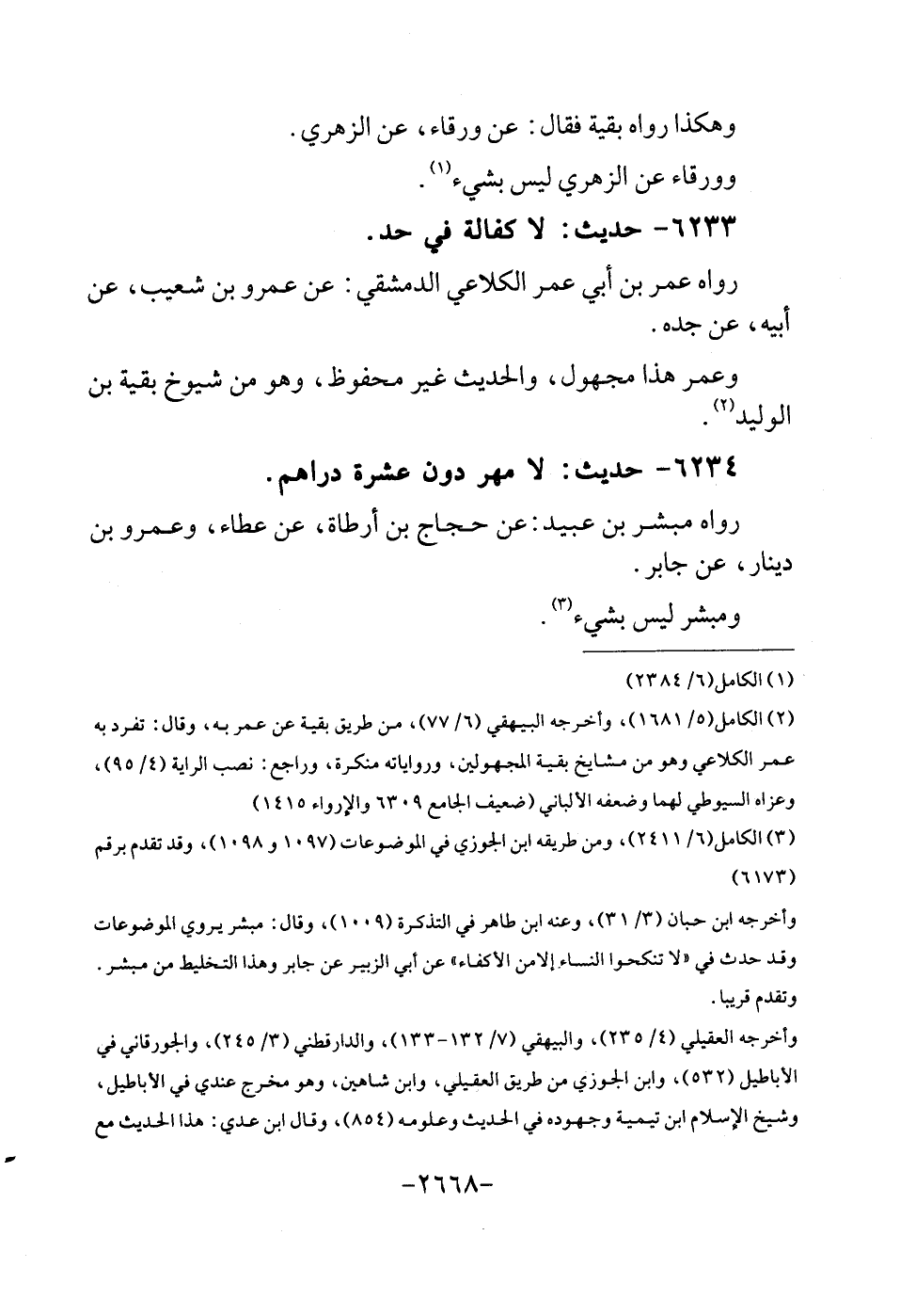 6233 - حَدِيث: لَا كَفَالَة فِي حد. رَوَاهُ عمر بن أبي عمر الكلَاعِي الدِّمَشْقِي: عَن عَمْرو بن شُعَيْب، عَن أَبِيه، عَن جده. وَعمر هَذَا مَجْهُول، والْحَدِيث غير مَحْفُوظ، وَهُوَ من شُيُوخ بَقِيَّة بن الْوَلِيد.