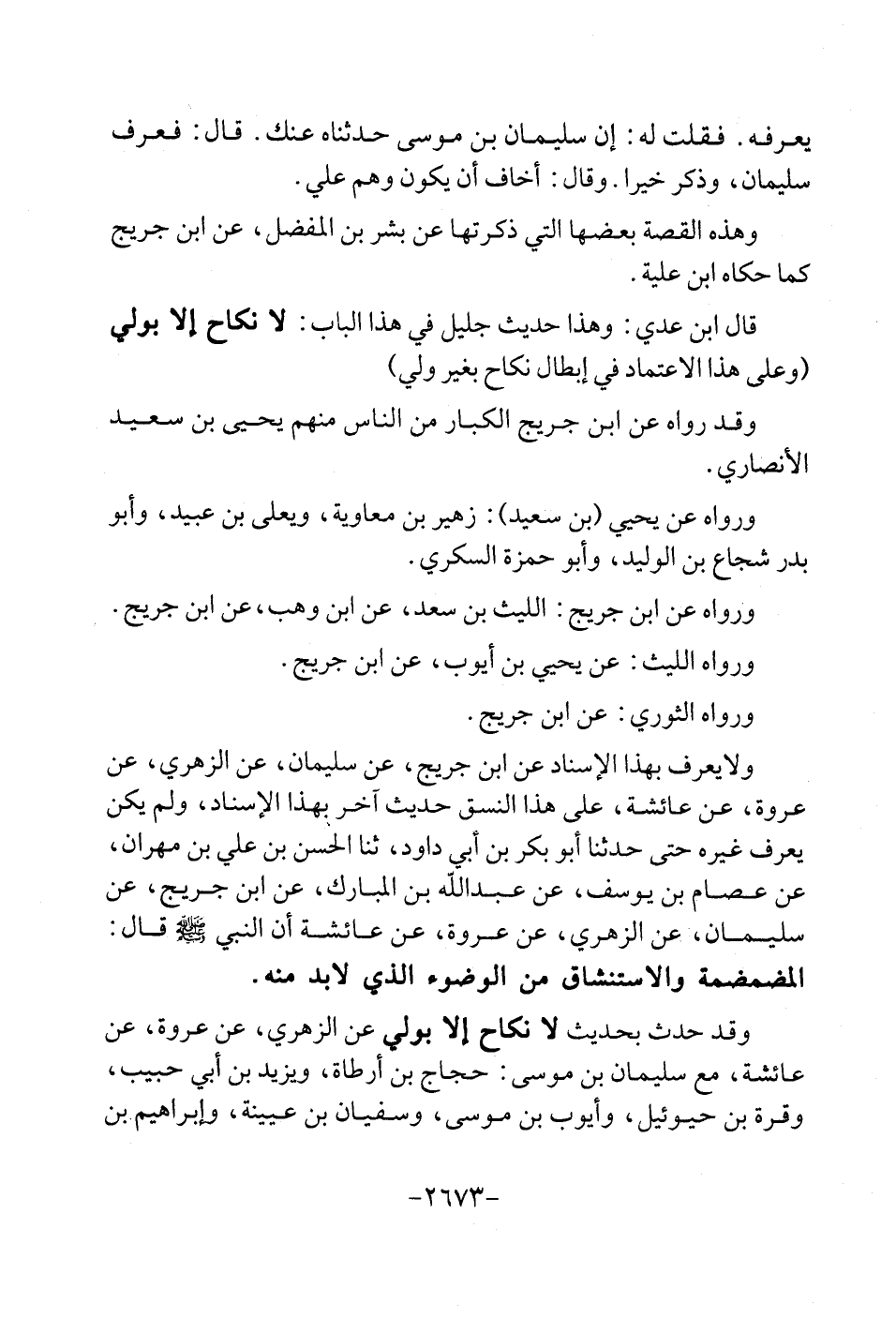 يعرفهُ. فَقلت لَهُ: إِن سُلَيْمَان بن مُوسَى حدّثنَاهُ عَنْك: قَالَ: فَعرف سُلَيْمَان، وَذكر خيرا. وَقَالَ: أَخَاف أَن يكون وهم عَليّ. وَهَذِه الْقِصَّة بَعْضهَا الَّتِي ذكرتها عَن بشر بن الْمفضل، عَن ابْن جريج كَمَا حَكَاهُ ابْن علية. قَالَ ابْن عدي: وَهَذَا حَدِيث جليل فِي هَذَا الْبَاب: لَا نِكَاح إِلَّا بولِي (وعَلى هَذَا الِاعْتِمَاد فِي إبِْطَال نِكَاح بِغَيْر ولي) . وَقد رَوَاهُ عَن ابْن جريج الْكِبَار من النَّاس مِنْهُم يحيى بن سعيد الْأنْصَارِيّ. وَرَوَاهُ عَن يحيى (بن سعيد) : زُهَيْر بن مُعَاوِيَة، وَيعْلي بن عبيد، وَأَبُو بدر شُجَاع بن الْوَلِيد، وَأَبُو حَمْزَة السكرِي. وَرَوَاهُ عَن ابْن جريج: اللَّيْث بن سعد، عَن ابْن وهب، عَن ابْن جريج. وَرَوَاهُ اللَّيْث: عَن يحيى بن أَيُّوب، عَن ابْن جريج. وَرَوَاهُ الثَّوْريّ: عَن ابْن جريج. وَلَا يعرف بِهَذَا الاسناد عَن ابْن جريج، عَن سُلَيْمَان عَن الزُّهْرِيّ، عَن عُرْوَة، عَن عَائِشَة، على هَذَا النسق حَدِيث آخر بِهَذَا الاسناد، وَلم يكن يعرف غَيره حَتَّى حَدثنَا أَبُو بكر بن أبي دَاوُد، ثَنَا الْحسن بن عَليّ بن مهْرَان، عَن عِصَام بن يُوسُف، عَن عبد الله بن الْمُبَارك، عَن ابْن جريج، عَن سُلَيْمَان، عَن الزُّهْرِيّ، عَن عُرْوَة، عَن عَائِشَة ان النَّبِي - صلى الله عَلَيْهِ وَسلم - قَالَ: المضمضمة وَالِاسْتِنْشَاق من الْوضُوء الَّذِي لَا بُد مِنْهُ. وَقد حدث بِحَدِيث لَا نِكَاح إِلَّا بولِي عَن الزُّهْرِيّ، عَن عُرْوَة، عَن عَائِشَة، مَعَ سُلَيْمَان بن مُوسَى: حجاج بن أَرْطَاة، وَيزِيد بن أبي حبيب، وقرة بن حيوئيل، وَأَيوب بن مُوسَى، وسُفْيَان بن عُيَيْنَة، وَإِبْرَاهِيم بن