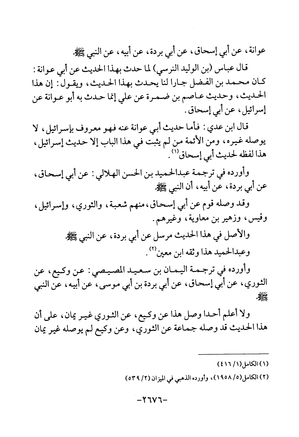 عوَانَة، عَن أبي اسحاق، عَن أبي بردة، عَن أَبِيه، عَن النَّبِي - صلى الله عَلَيْهِ وَسلم -. قَالَ عَبَّاس (بن الْوَلِيد النَّرْسِي) لما حدث بِهَذَا الحَدِيث عَن أبي عوَانَة: كَانَ مُحَمَّد بن الْفضل جاراً لنا يحدث بِهَذَا الحَدِيث، وَيَقُول: إِن هَذَا الحَدِيث، وَحَدِيث عَاصِم بن ضَمرَة عَن عَليّ إِنَّمَا حدث بِهِ أَبُو عوَانَة عَن اسرائيل، عَن أبي اسحاق. قَالَ ابْن عدي: فَأَما حَدِيث أبي عوَانَة عَنهُ فَهُوَ مَعْرُوف بإسرائييل، لَا يوصله غَيره، وَمن الْأَئِمَّة من لم يثبت فِي هَذَا الْبَاب إِلَّا حَدِيث إِسْرَائِيل، هَذَا لَفْظَة لحَدِيث أبي إِسْحَاق. وَأوردهُ فِي تَرْجَمَة عبد الحميد بن الْحسن الْهِلَالِي: عَن أبي اسحاق، عَن أبي بردة، عَن أَبِيه، أَن النَّبِي - صلى الله عَلَيْهِ وَسلم -. وَقد وَصله قوم عَن أبي إِسْحَاق، مِنْهُم شُعْبَة، وَالثَّوْري، وأسرائيل، وَقيس، وَزُهَيْر بن مُعَاوِيَة، وَغَيرهم. وَالْأَصْل فِي هَذَا الحَدِيث مُرْسل عَن أبي بردة، عَن النَّبِي - صلى الله عَلَيْهِ وَسلم -. وَعبد الحميد هَذَا وثقة ابْن معِين. وَأوردهُ فِي تَرْجَمَة الْيَمَان بن سعيد المصِّيصِي: عَن وَكِيع، عَن الثَّوْريّ، عَن أبي اسحاق، عَن أبي بردة بن أبي مُوسَى، عَن أَبِيه، عَن النَّبِي - صلى الله عَلَيْهِ وَسلم -. وَلَا أعلم أحد وصل هَذَا عَن وَكِيع، عَن الثَّوْريّ غير يمَان، على أَن هَذَا الحَدِيث قد وَصله جمَاعَة عَن الثَّوْريّ، وَعَن وَكِيع لم يوصله غير يمَان
