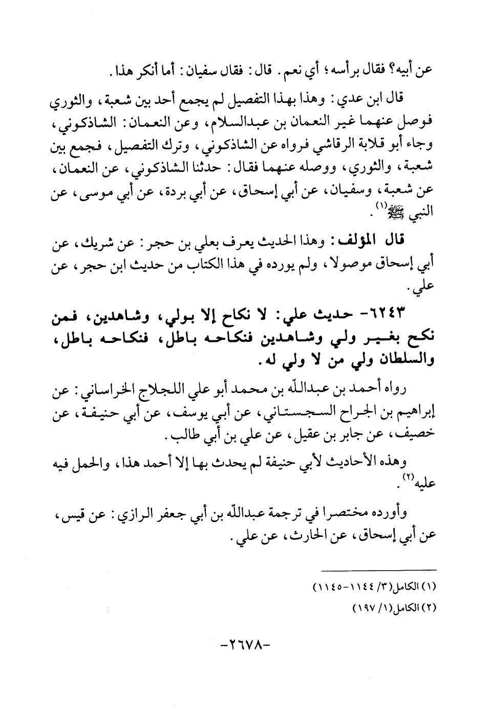 6243 - حَدِيث عَليّ: لَا نِكَاح إِلَّا بولِي، وشاهدين، فَمن نكح بِغَيْر ولي وشاهدين فنكاحه بَاطِل، فنكاحه بَاطِل، وَالسُّلْطَان ولي من لَا ولي لَهُ. رَوَاهُ أَحْمد بن عبد الله بن مُحَمَّد أَبُو عَليّ اللَّجْلَاج الْخُرَاسَانِي: عَن إِبْرَاهِيم بن الْجراح السجسْتانِي، عَن أبي يُوسُف، عَن أبي حنيفَة، عَن خصيف، عَن جَابر بن عقيل، عَن عَليّ بن أبي طَالب. وَهَذِه الْأَحَادِيث لأبي حنيفَة لم يحدث بهَا إِلَّا أَحْمد هَذَا، وَالْحمل فِيهِ عَلَيْهِ. وَأوردهُ مُخْتَصرا فِي تَرْجَمَة عبد الله بن أبي جَعْفَر الرَّازِيّ: عَن قيس، عَن أبي إِسْحَاق، عَن الْحَارِث، عَن عَليّ.
