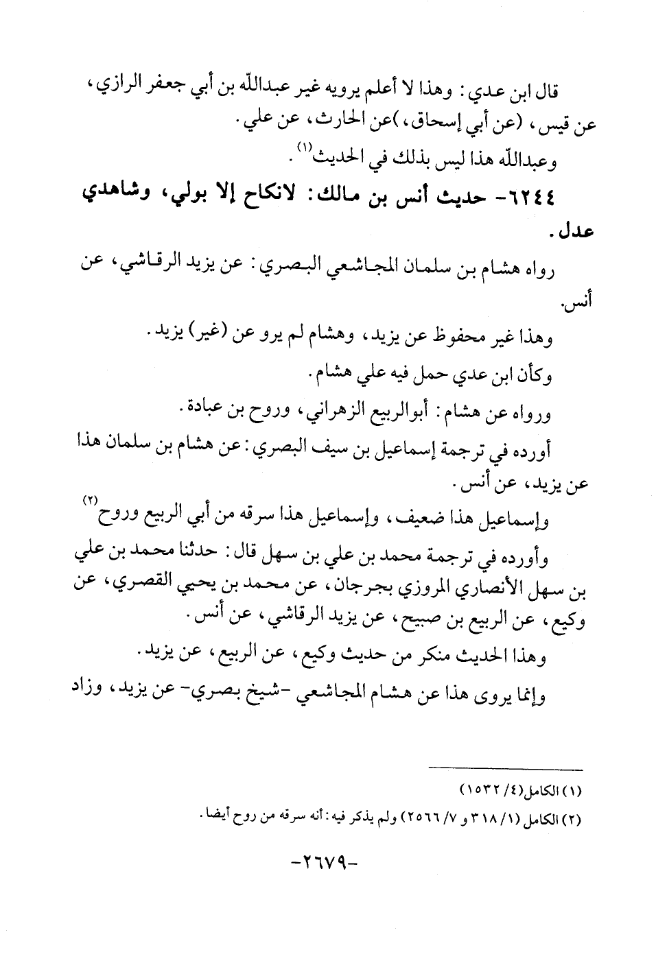 6244 - حَدِيث أنس بن مَالك: لَا نِكَاح إِلَّا بولِي، وشاهدي عدل. رَوَاهُ هِشَام بن سُلَيْمَان الْمُجَاشِعِي الْبَصْرِيّ: عَن يزِيد الرقاشِي، عَن أنس. وَهَذَا غير مَحْفُوظ عَن يزِيد، وَهِشَام لم يرو عَن (غير) يزِيد. وَكَأن ابْن عدي حمل فِيهِ عَليّ هِشَام. وَرَوَاهُ عَن هِشَام: أَبُو الرّبيع الزهْرَانِي، وروح بن عبَادَة. أوردهُ فِي تَرْجَمَة إِسْمَاعِيل بن سيف الْبَصْرِيّ: عَن هِشَام بن سُلَيْمَان هَذَا عَن يزِيد، عَن أنس. وَإِسْمَاعِيل هَذَا ضَعِيف، وَإِسْمَاعِيل هَذَا سَرقه من أبي الرّبيع وروح. وَأوردهُ فِي تَرْجَمَة مُحَمَّد بن عَليّ بن سهل الْأنْصَارِيّ الْمروزِي بجرجان، عَن مُحَمَّد بن يحيى القصري، عَن وَكِيع، عَن الرّبيع بن صبيح، عَن يزِيد الرقاشِي، عَن انس. وَهَذَا الحَدِيث مُنكر من حَدِيث وَكِيع، عَن الرّبيع، عَن يزِيد. وَإِنَّمَا يروي هَذَا عَن هِشَام الْمُجَاشِعِي - شيخ بَصرِي - عَن يزِيد، وَزَاد